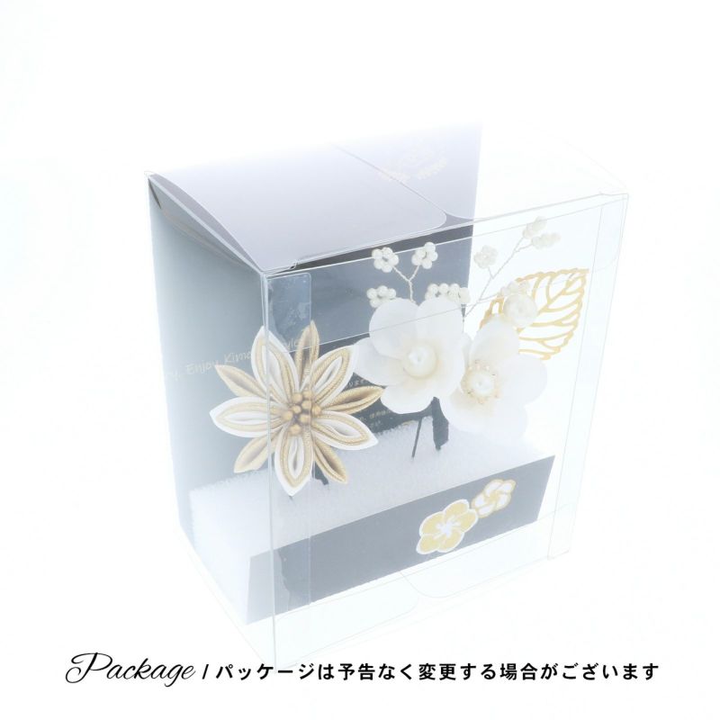 2.シロ 梅につまみの菊:白の花びらにパールの蕊の梅2輪、白のビーズついた枝飾り、パールビーズにゴールドの透かしのメタルリーフのUピン1点。白とゴールドの2重剣つまみの菊のUピン1点。