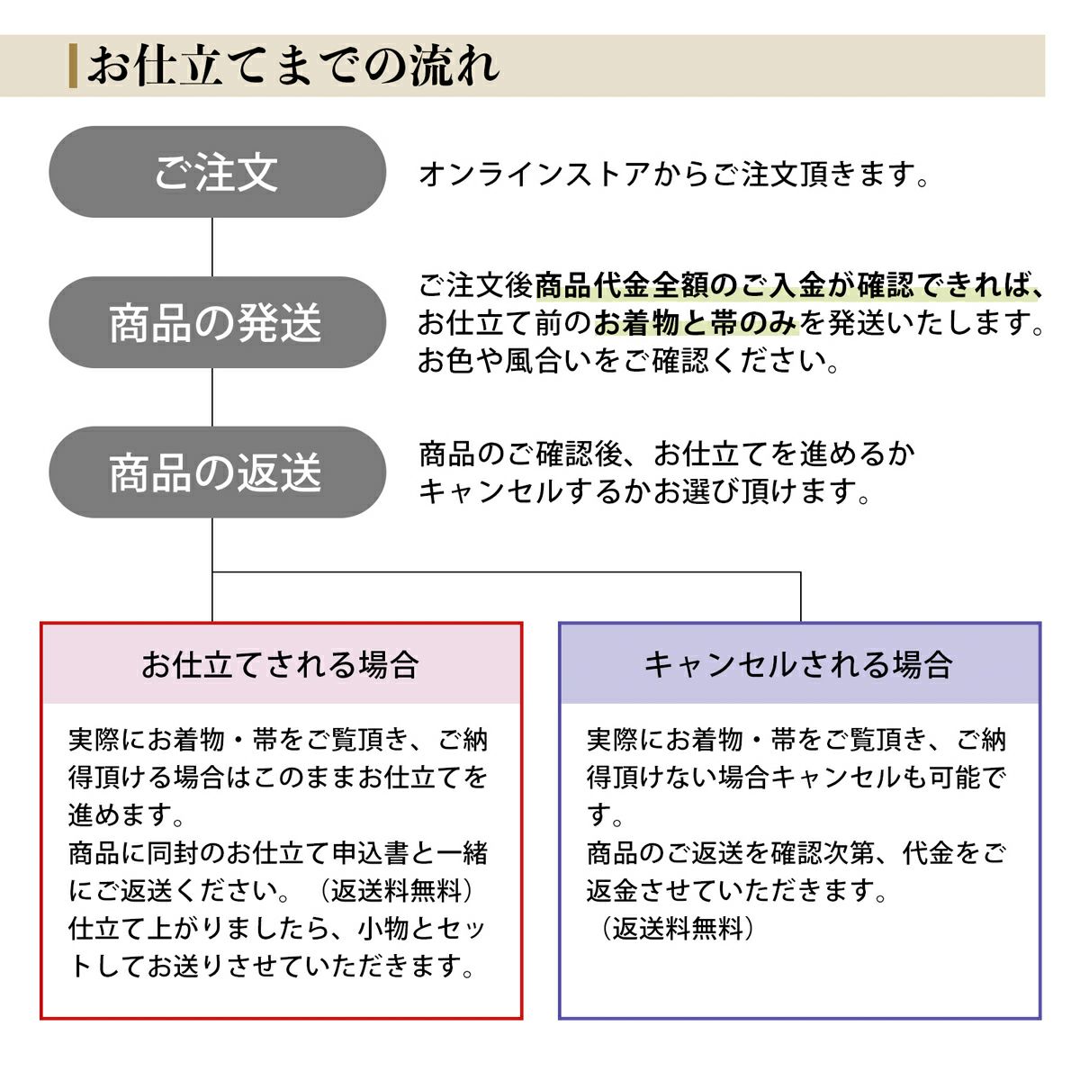 5. 当店でのお仕立て or キャンセル希望の場合は商品を着払い伝票で返送いただく