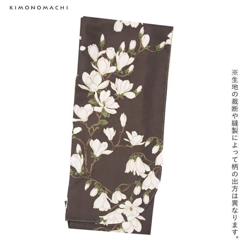 【色柄】ココアのような浅い茶色の地に枝を伸ばした白木蓮。淡いベージュのぼかしが入った白い花にこげ茶の枝、萼や蕊の深い黄緑がポイントです。薄香色の輪郭線が柔らかい印象を添え、咲きこぼれる木蓮の優美な魅力を演出しています。裏地はベージュ。