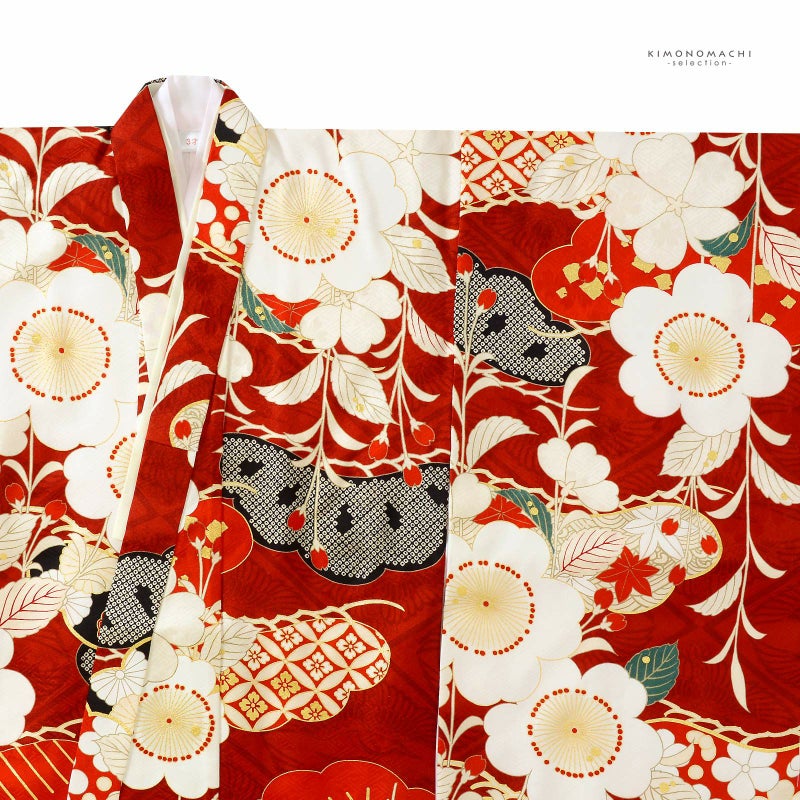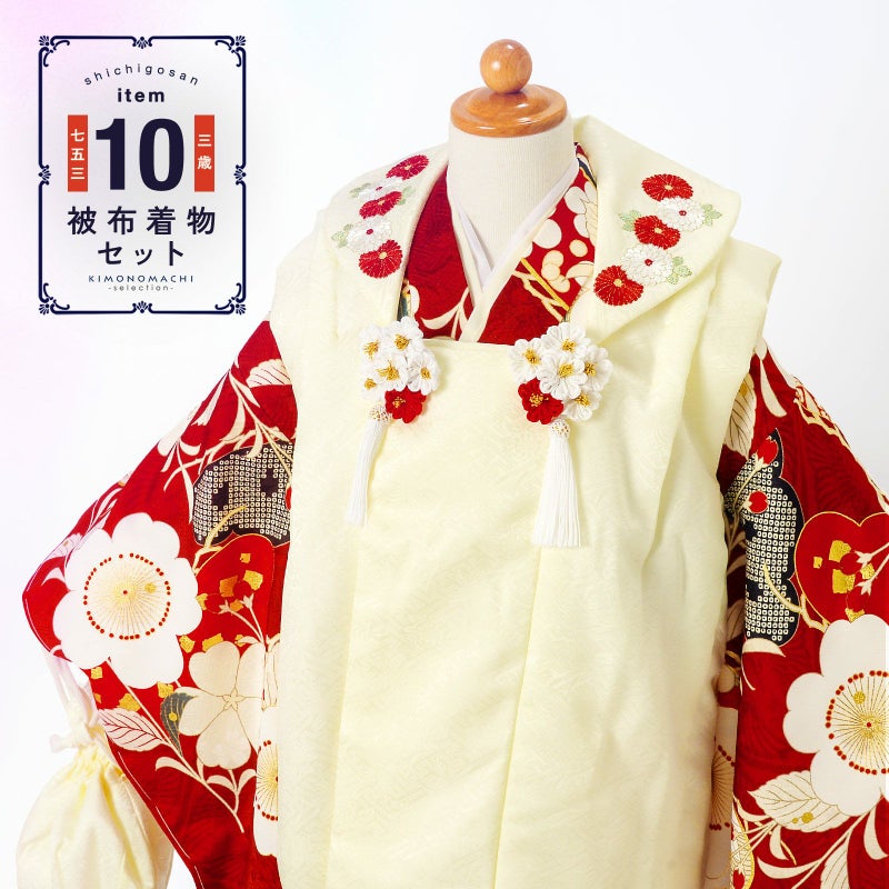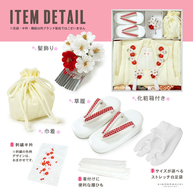 【商品内容】着物・長襦袢・重ね衿(縫い付け済)・被布コート・巾着・髪飾り・草履・刺繍半襟(プレゼント)・足袋(プレゼント)・腰ひも2本(プレゼント)の計10点
