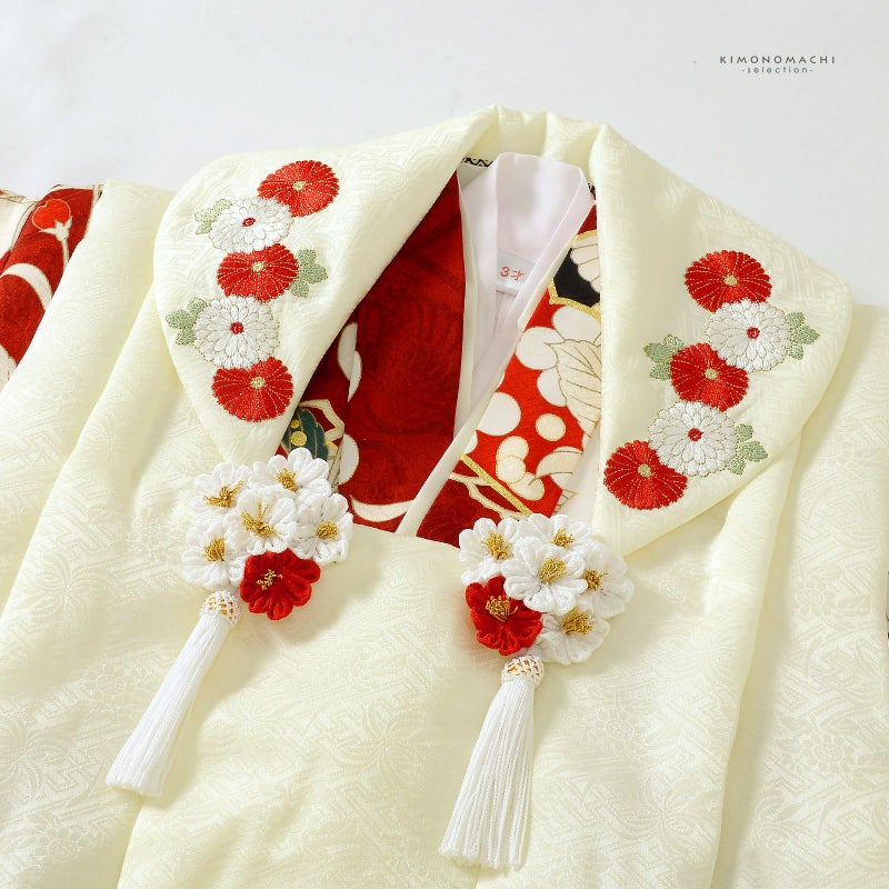 6. 七五三 着物 3歳 女の子 ブランド被布セット 紅一点「アイボリー、茜色 向かい鶴地に松、桜」三歳女児被布セット 子供着物 フルセット 三才のお祝い着 3才向け【メール便不可】