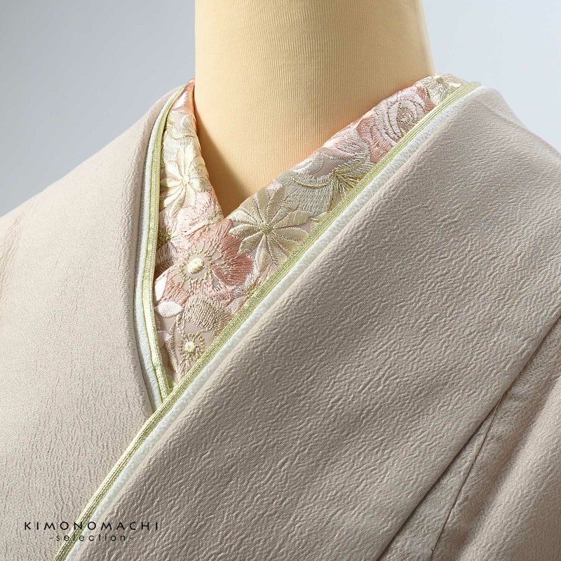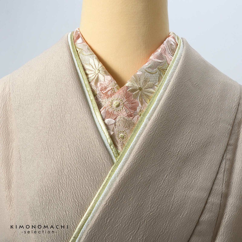 半衿自体のおしゃれに加えて、長襦袢の襟元の汚れを防ぐ役割と、着付けを美しく見せる役割も担っています。