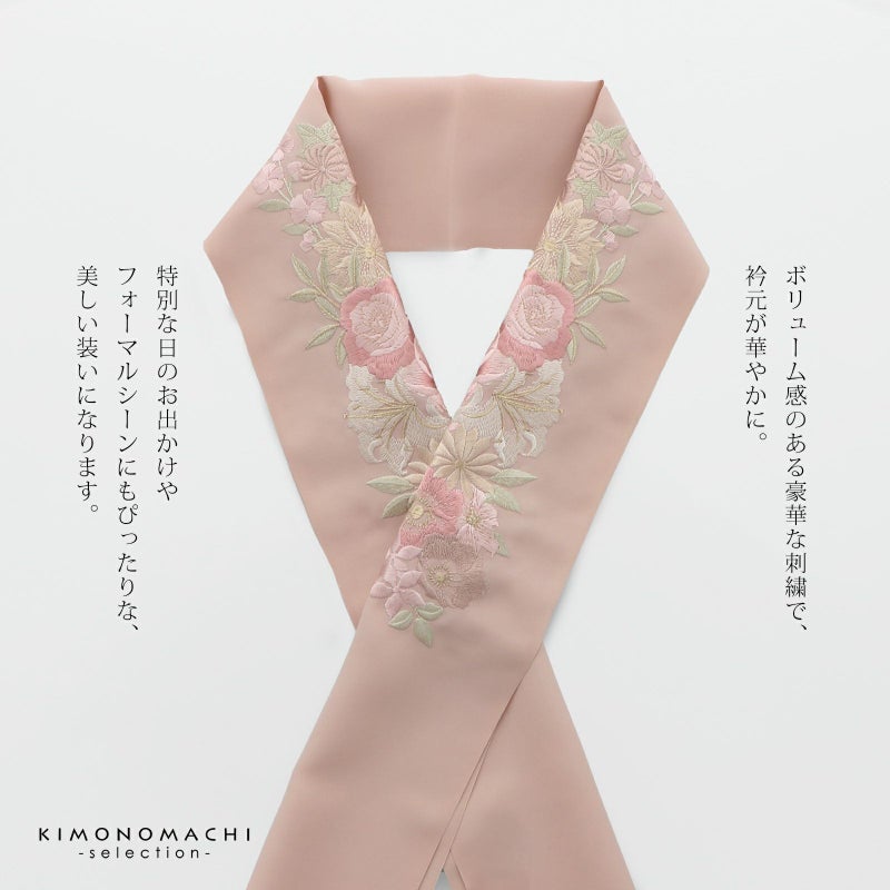 刺繍 半衿 単品 silelly シルエリー「ローズ ミスティピンク」日本製 刺繍半襟 振袖用半衿 前撮り 成人式 刺繍衿 ポリエステル半衿【メール便不可】