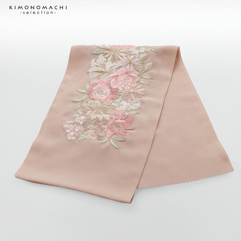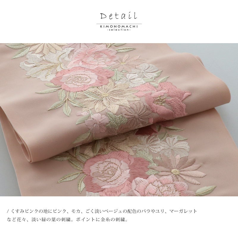 【色柄】くすみピンクの地にピンク、モカ、ごく淡いベージュの配色のバラやユリ、マーガレットなど花々、淡い緑の葉の刺繍。ポイントに金糸の刺繍。