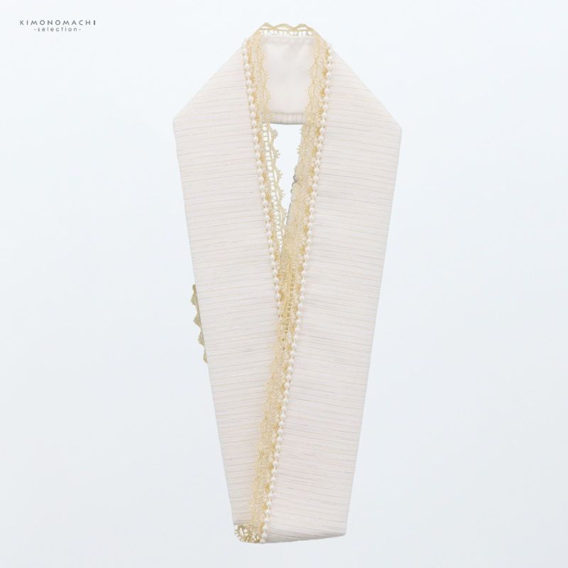 【色柄】オフホワイトの地に金銀のラメ糸が織り込まれた重ね衿。縁に白色系のパールビーズ、ラメの入ったゴールドのレース。