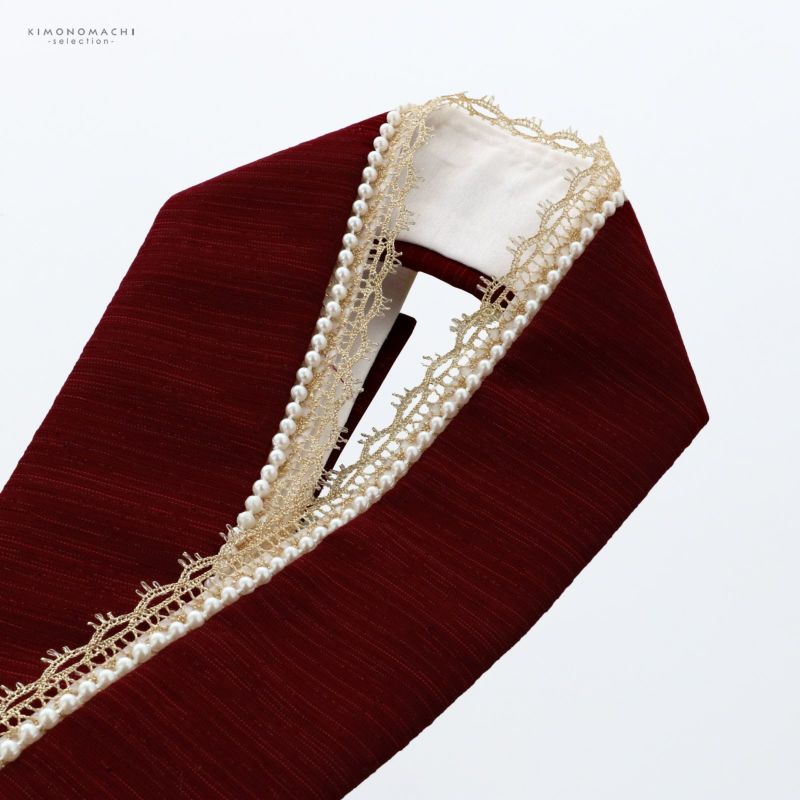 【色柄】深いワインレッド地に赤系のラメ糸が織り込まれた重ね衿。縁に白色系のパールビーズ、ラメの入ったゴールドのレース。