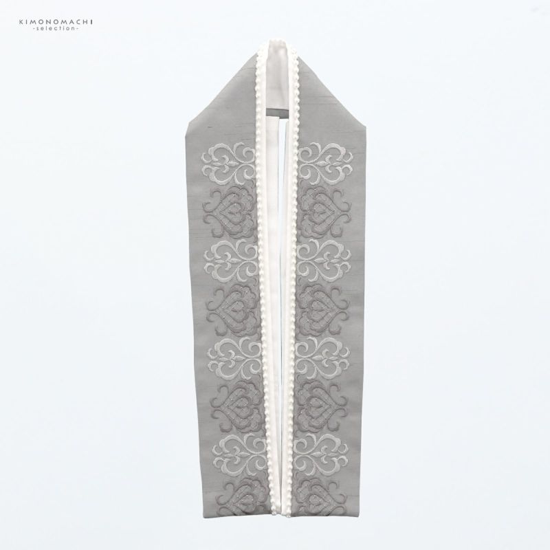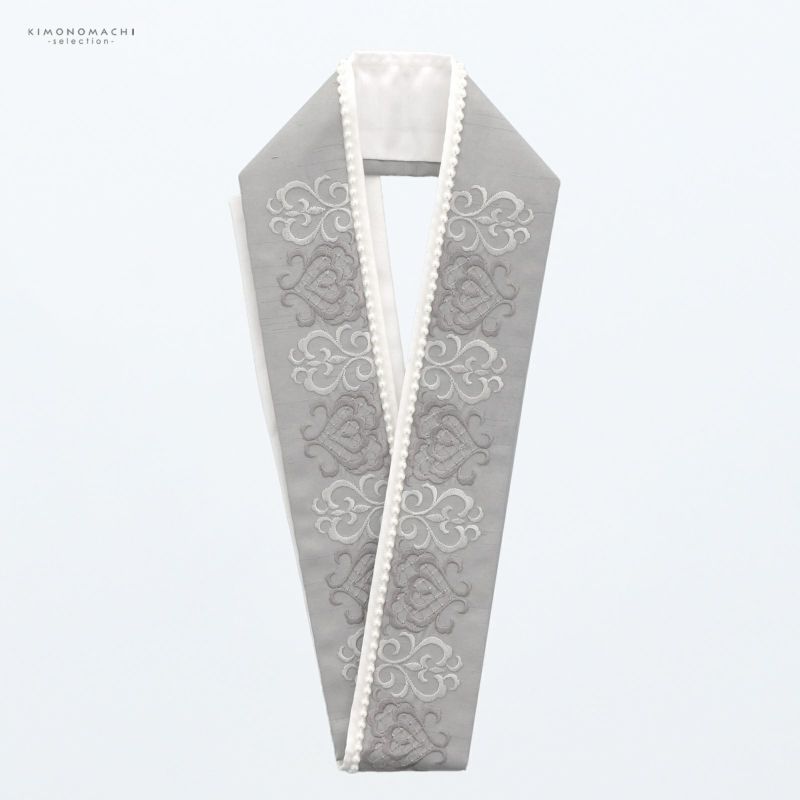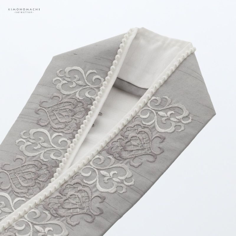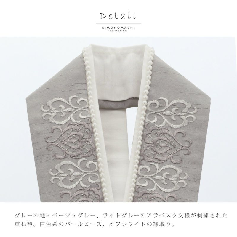 【色柄】グレーの地にベージュグレー、ライトグレーのアラベスク文様が刺繍された重ね衿。白色系のパールビーズ、オフホワイトの縁取り。