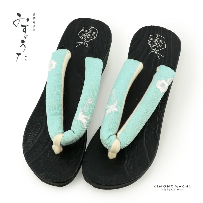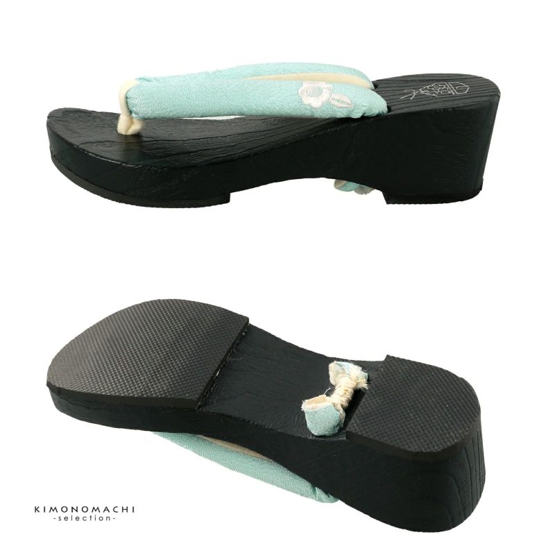 【色柄】足形に添ったカーブのあるヒールタイプの台。台の色は黒色、かかとに鈴の絵。鼻緒はミントブルーの地に白の小鳥と鈴、ツバキの花の刺繍。鼻緒の裏地と前坪はアイボリー。