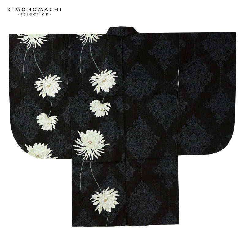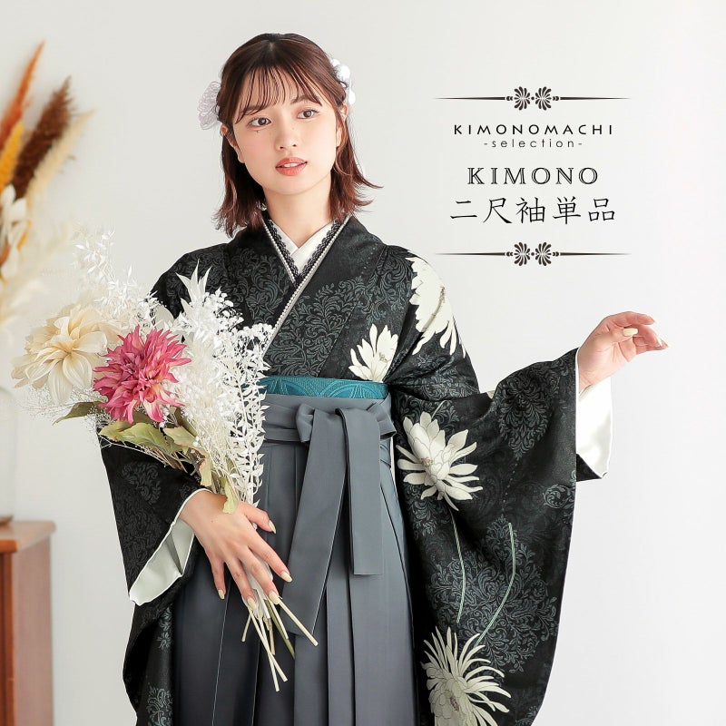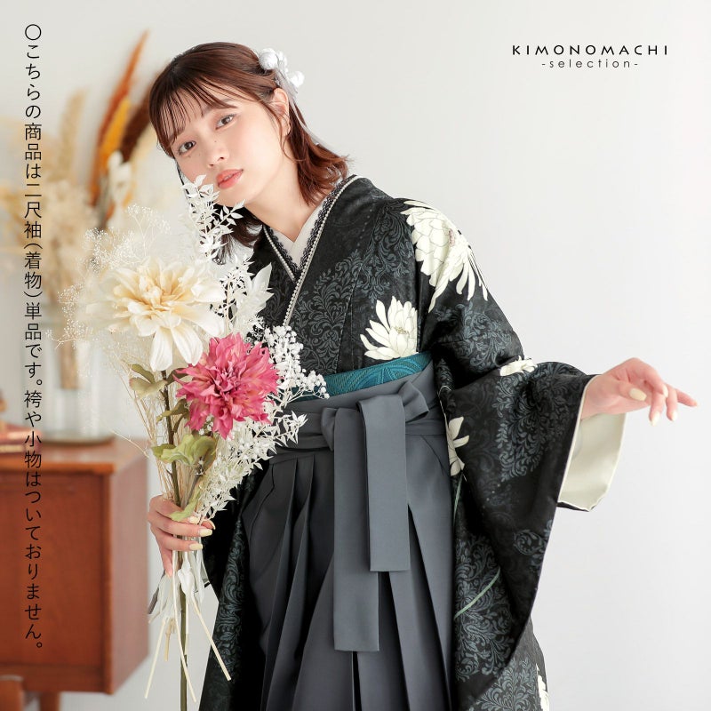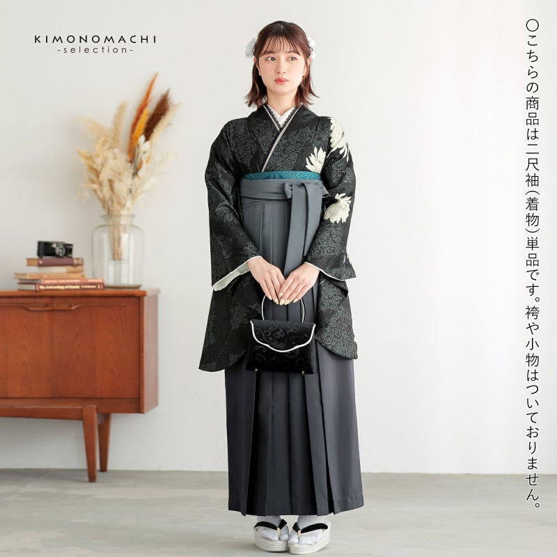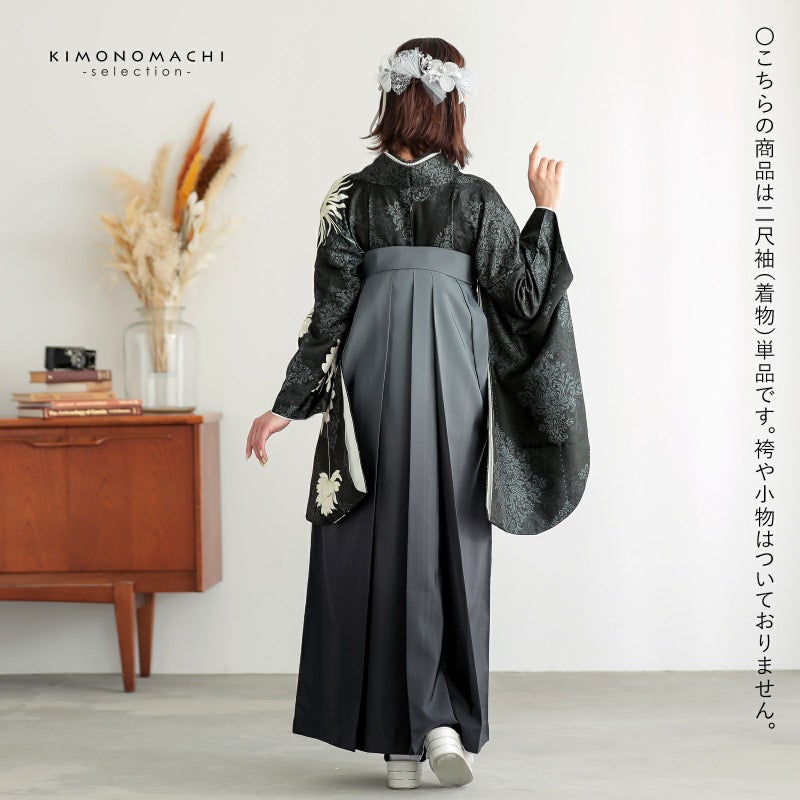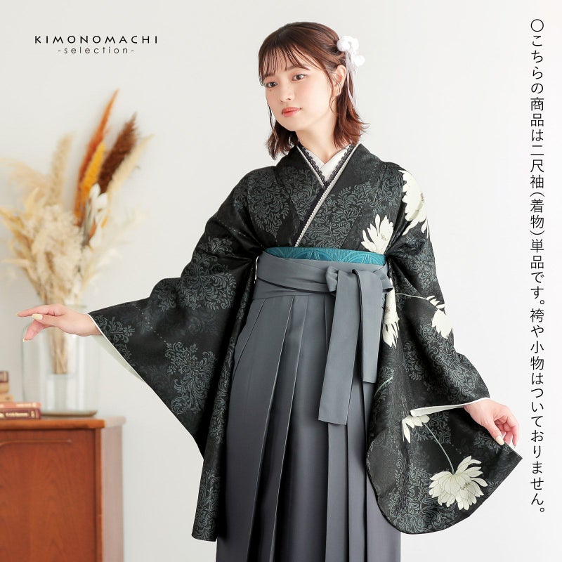 二尺袖着物 単品 半身変わり「スチールブラック アラベスク、月花」Fサイズ お仕立て上がり 短丈 ショート丈 レディース 洗える着物 二尺袖 着物 袴に合わせて 卒業式 謝恩会【メール便不可】