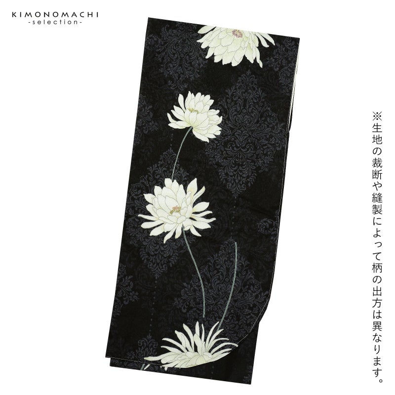 【色柄】ラメのような光沢のあるブラックの地にアラベスク文様が全体に表現されています。上前側(左)の身頃と袖には、白に淡い黄緑、ベージュのぼかしが入った月下美人のようなお花。