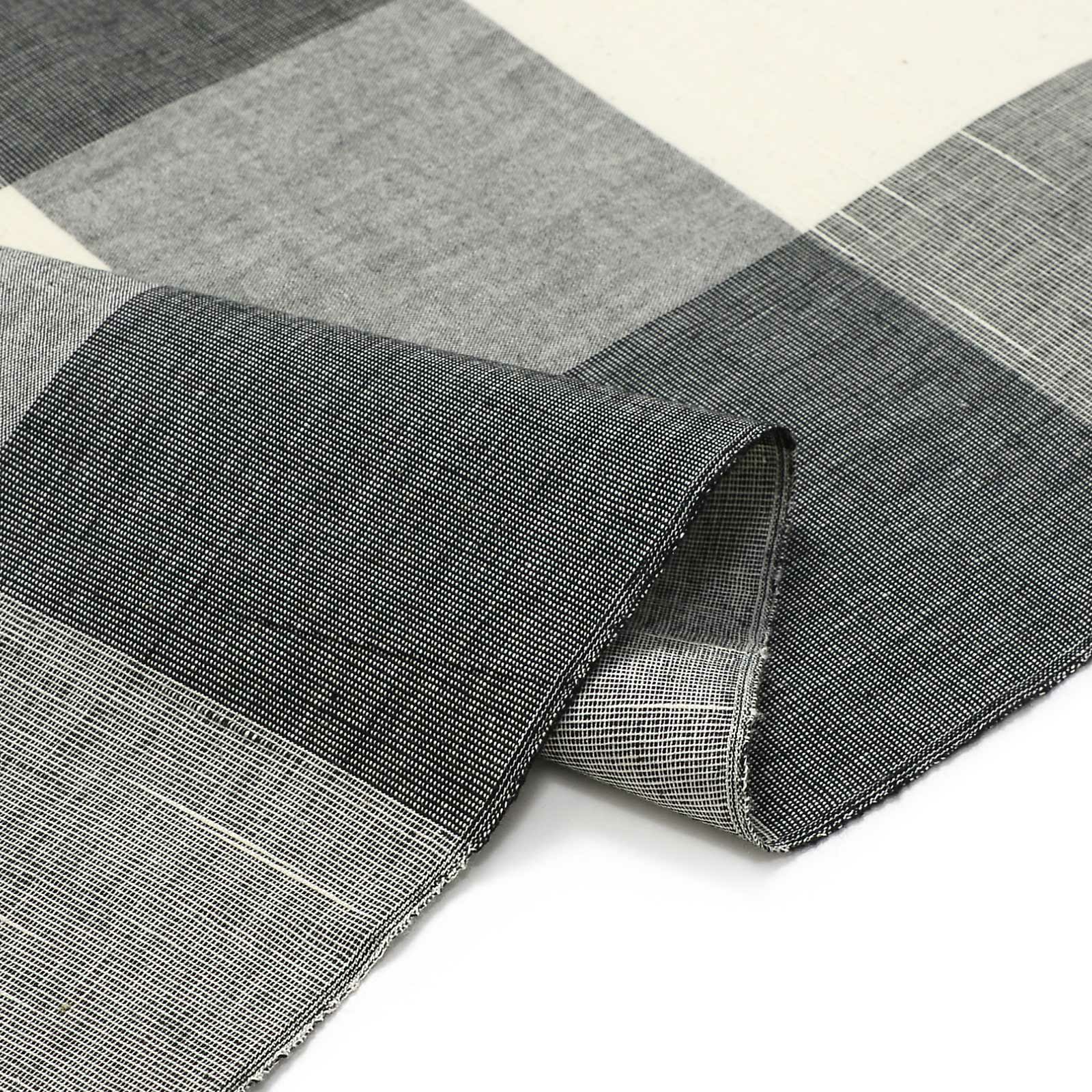 【色柄】オフホワイトに縦筋の入った濃いグレー、横段に薄い杢グレーを重ねた約10cm角ほどのブロックチェック。無彩色がスッキリとして格好いい格子です。