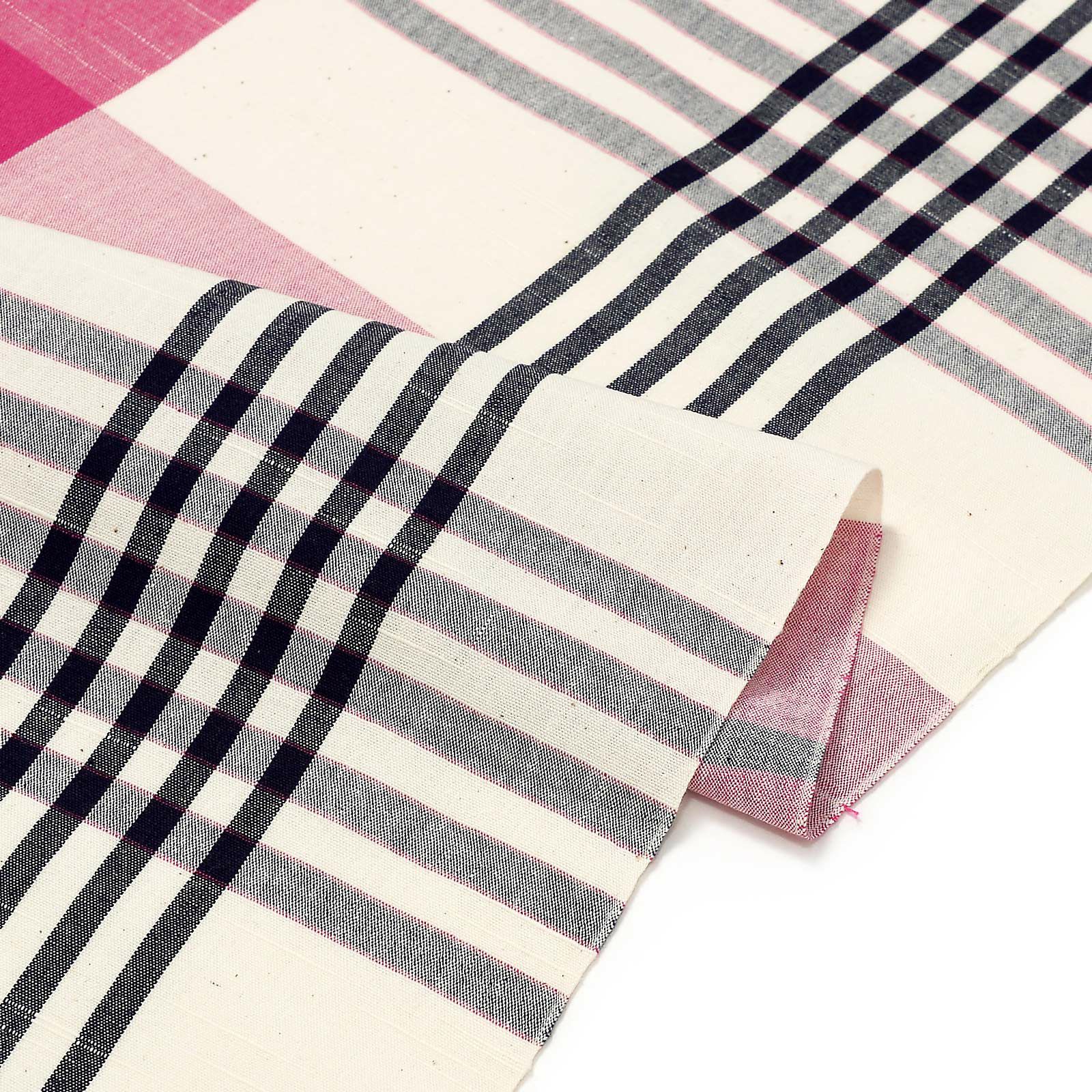【色柄】生成色みの白にやや鈍い赤紫色の格子。紺の五本縞と一本縞を重ねた格子。はっきりとした色彩がモダンで可愛らしい印象です。