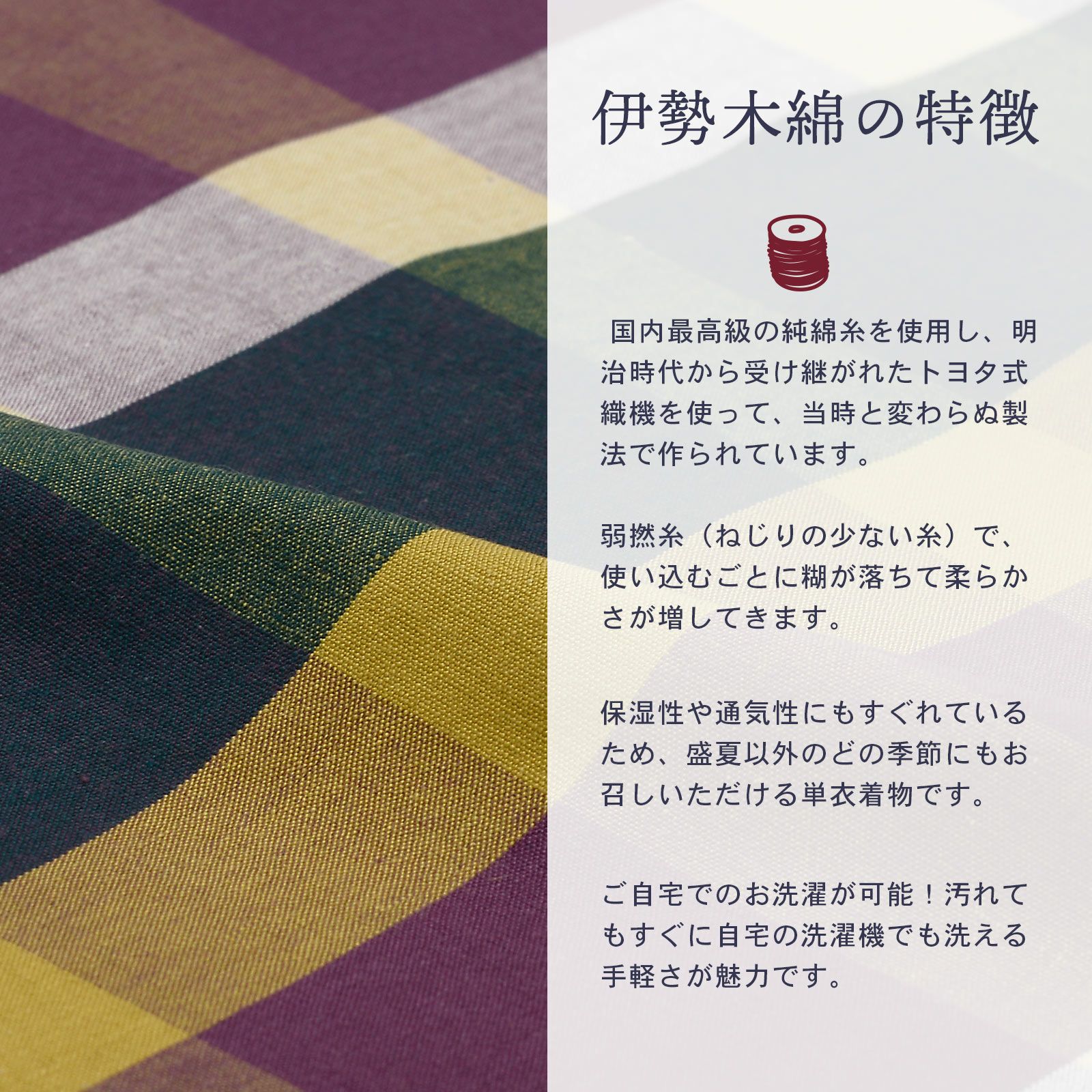 ゆっくりと時間をかけて丁寧に織り上げられた伊勢木綿の優しく素朴な風合いを、ぜひ肌で感じ取ってください
