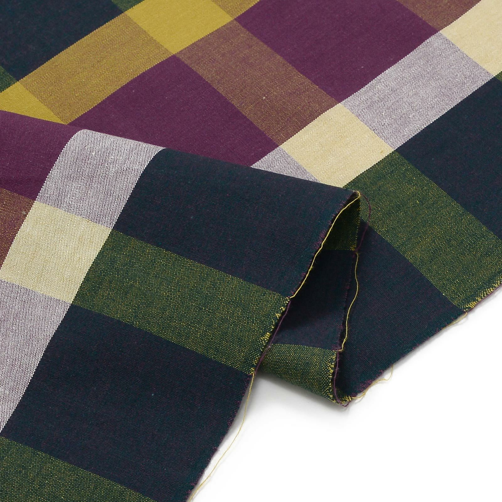 【色柄】青緑、赤紫、白、金茶色の配色、横段に淡い赤紫と金茶色を重ねた格子。温かみのある秋色の格子です。