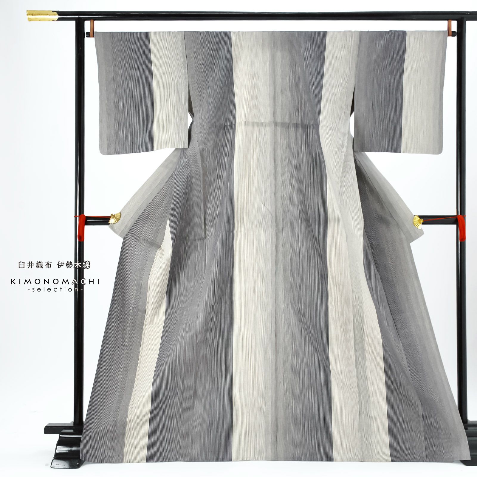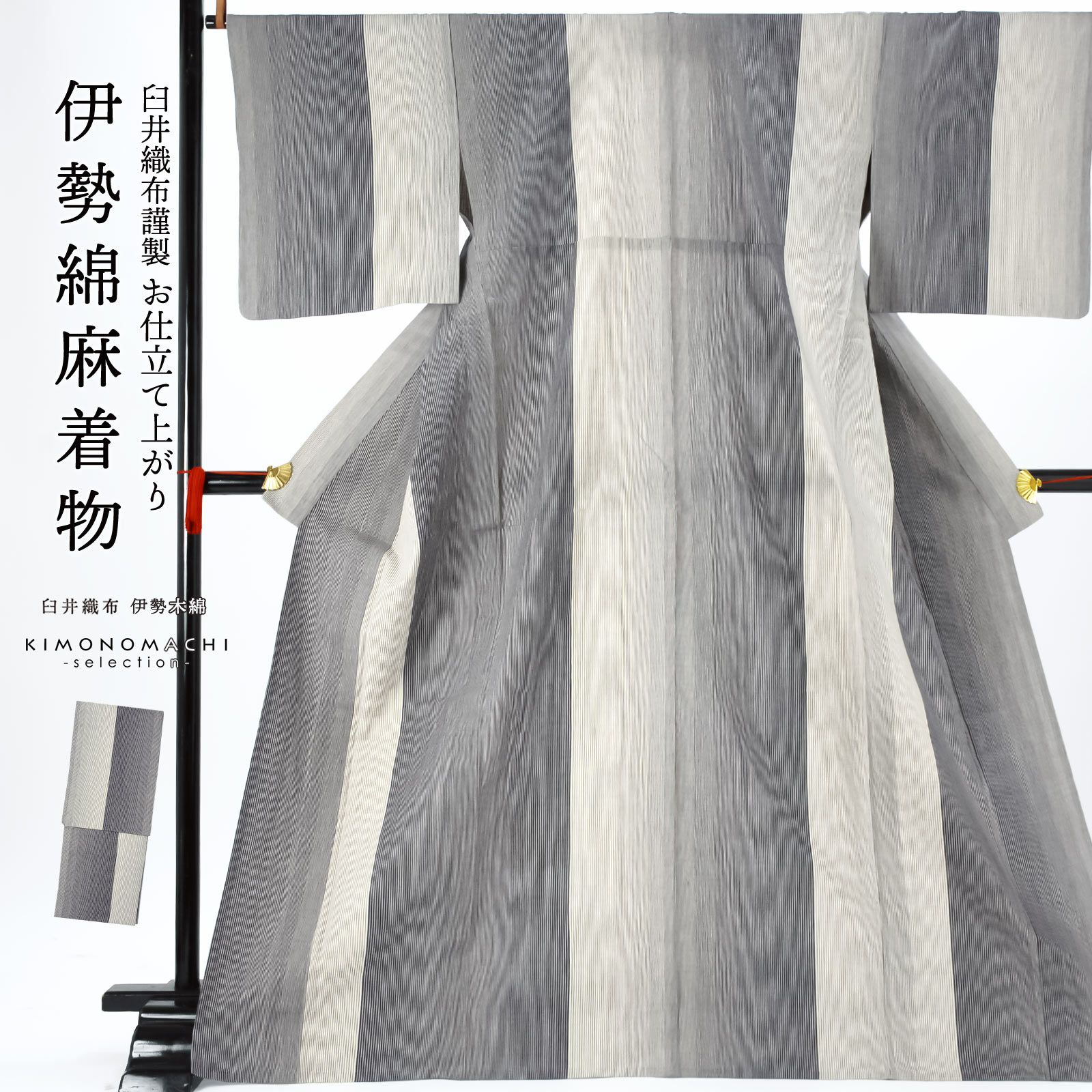 伊勢木綿 洗える着物 単品「貝割れ滝縞 グレー×アイボリー」お仕立て上がり 綿麻きもの 日本製 三重県 伝統工芸品 単衣 綿麻 カジュアル チェック 小紋 レディース キモノ kimono【メール便不可】