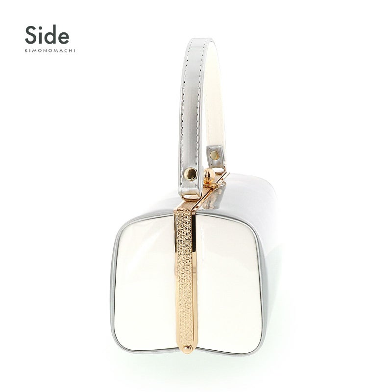 【色柄】バッグの裏表、持ち手の表は艶のあるシルバー。バッグ側面、持ち手の裏はオフホワイト。口金はゴールド。白と銀の組み合わせがシックで大人っぽい雰囲気。草履の鼻緒はオフホワイト、台はシルバーの天に二枚芯の巻はオフホワイトとシルバー。