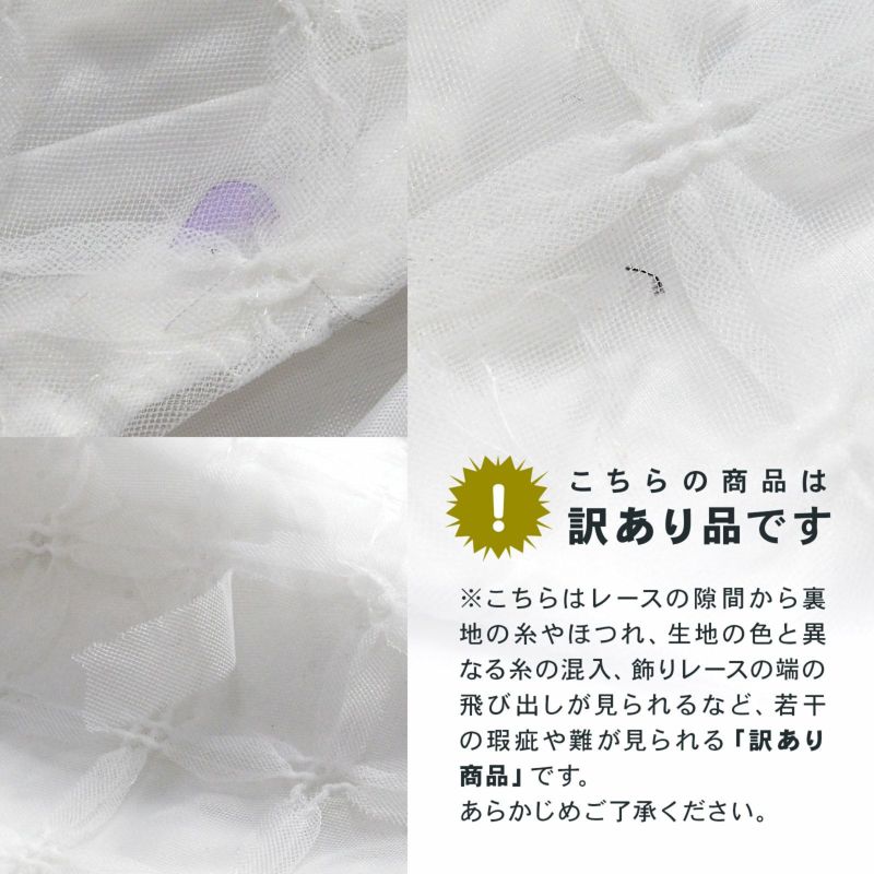 ご使用には問題ないものを訳アリ特価でご提供させて頂きます。 こちらはレースの隙間から裏地の糸のほつれ、生地の色と異なる糸の混入、飾りレースの端の飛び出しが見られるなど、若干の瑕疵や難が見られる「訳あり」商品です。