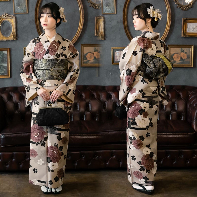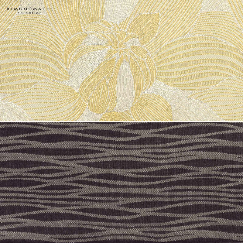 A.生成り色:生成り色の地にシルバーとイエローベージュの線で表現されたほころびかけの大きな菊の花。裏は浅紫色の乱れ縞。
