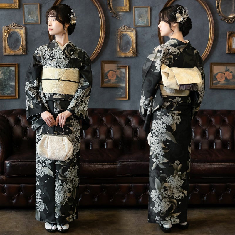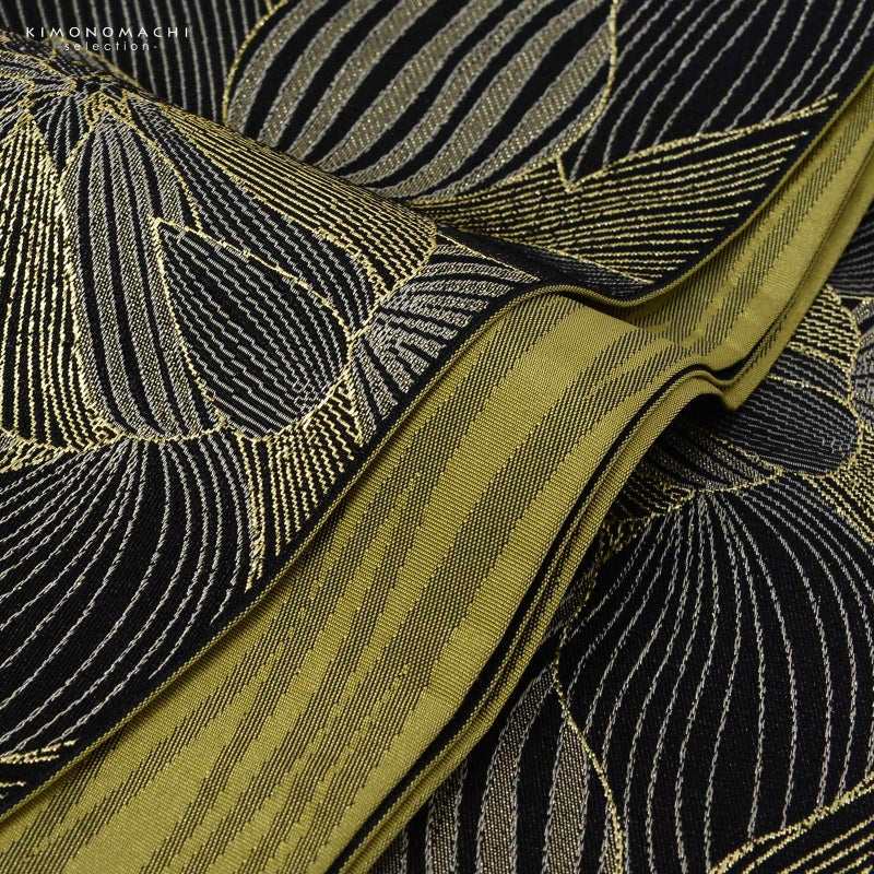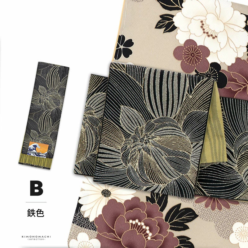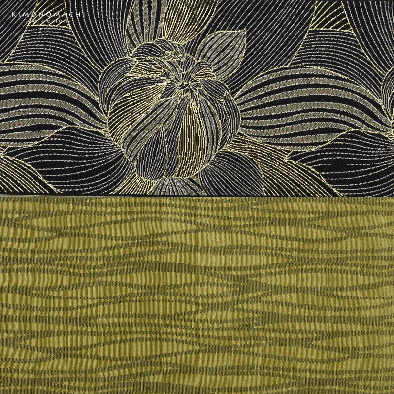 B.鉄色:やや青みを感じる黒地にゴールドと白金の線で表現されたほころびかけの大きな菊の花。裏はくすんだ黄色の乱れ縞。