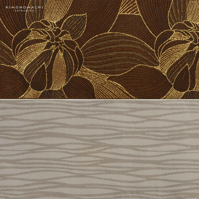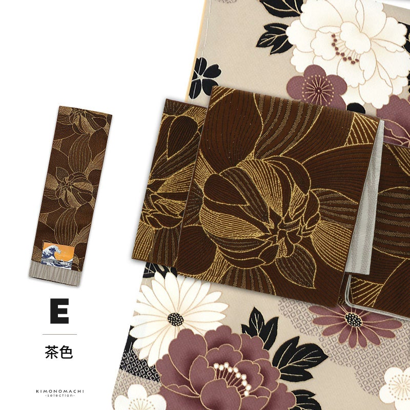 E.茶色:くっきりとした茶色の地にゴールドとこげ茶の線で表現されたほころびかけの大きな菊の花。裏はアイボリーグレーの乱れ縞。