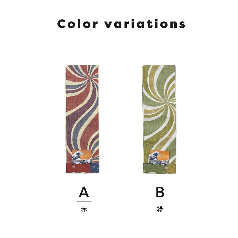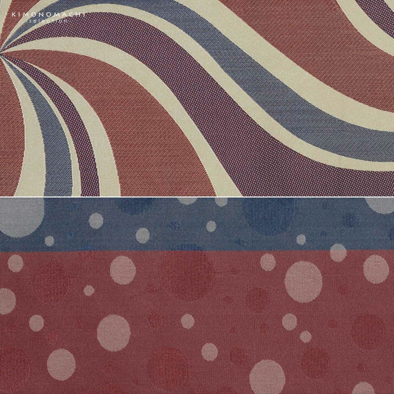 A.赤:黄みのベージュ地に幅の異なる赤、紫、青の渦巻き。裏は赤と青の地に織りで表現されたドット。