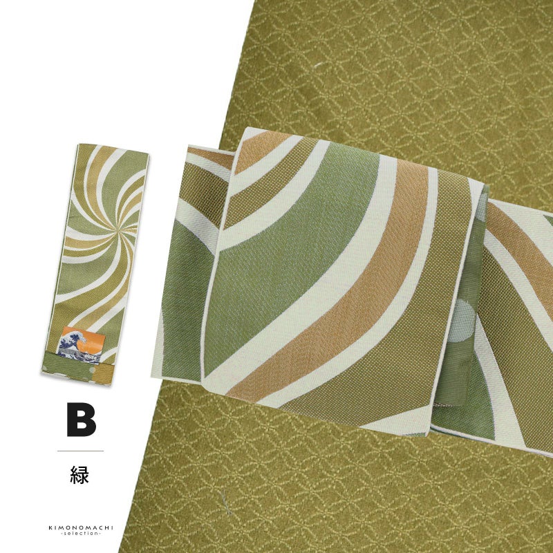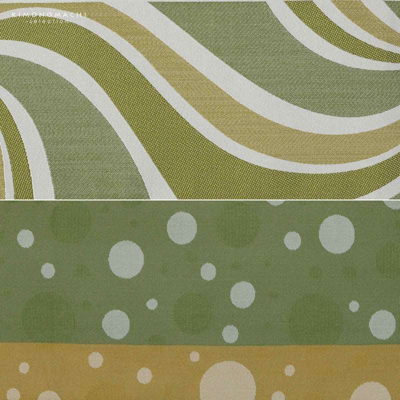 B.緑:浅い白地に幅の異なる黄緑、ライム、シトラスの渦巻き。裏は黄緑と鈍い黄色の地に織りで表現されたドット。