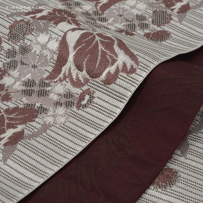 A.白×小豆色:グレイッシュな白に深いグレーの筋の入った地。白、グレー、小豆色でチューリップをメインとした花々が縦向きに織り出されています。裏は深い赤紫のヒヤシンス風のアラベスク文様。