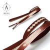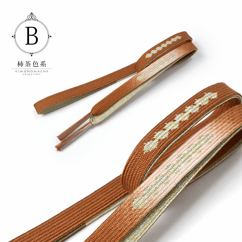 B.柿茶色系:橙みの茶色にピンク系のぼかしの地。金銀で菱繋ぎがデザインされた帯締めです。裏面は金銀。