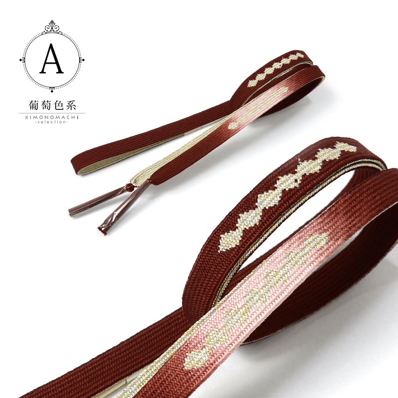 A.葡萄色系:深い赤紫にピンク系のぼかしの地。金銀で菱繋ぎがデザインされた帯締めです。裏面は金銀。
