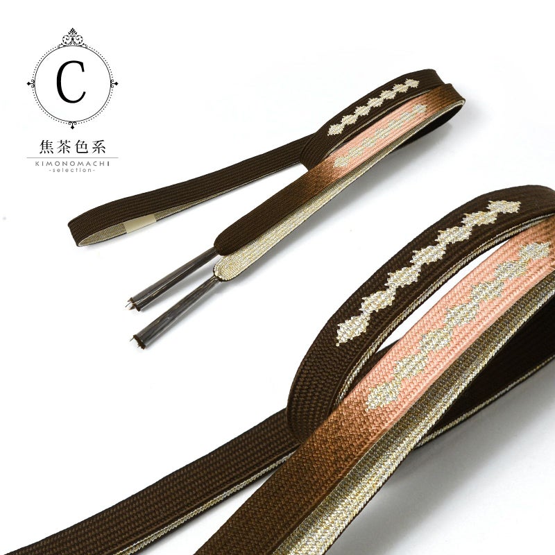 C.焦茶色系:深いこげ茶色にピンク系のぼかしの地。金銀で菱繋ぎがデザインされた帯締めです。裏面は金銀。