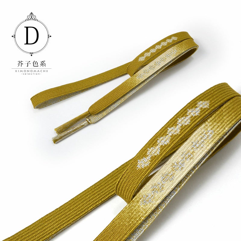 D.芥子色系:黄みの黄土色に生成り色系のぼかしの地。金銀で菱繋ぎがデザインされた帯締めです。裏面は金銀。