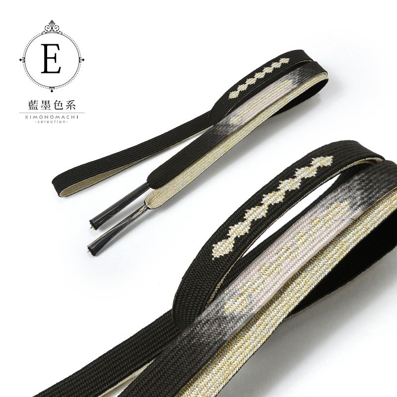 E.藍墨色系:やや青みの墨黒に鼠色系のぼかしの地。金銀で菱繋ぎがデザインされた帯締めです。裏面は金銀。