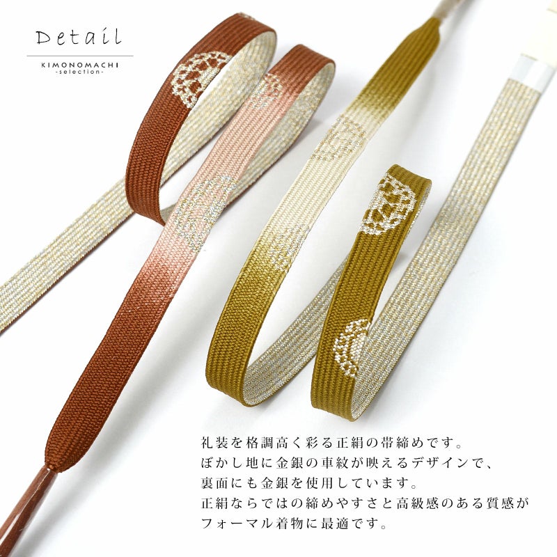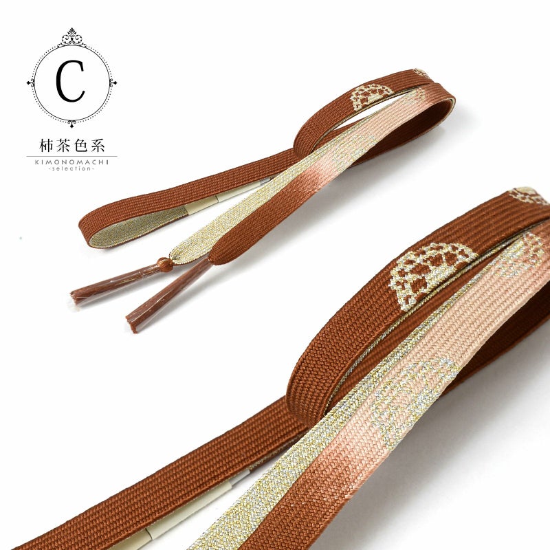 C.柿茶色系:橙みの茶色にピンク系のぼかしの地。金銀で車紋がデザインされた帯締めです。裏面は金銀。