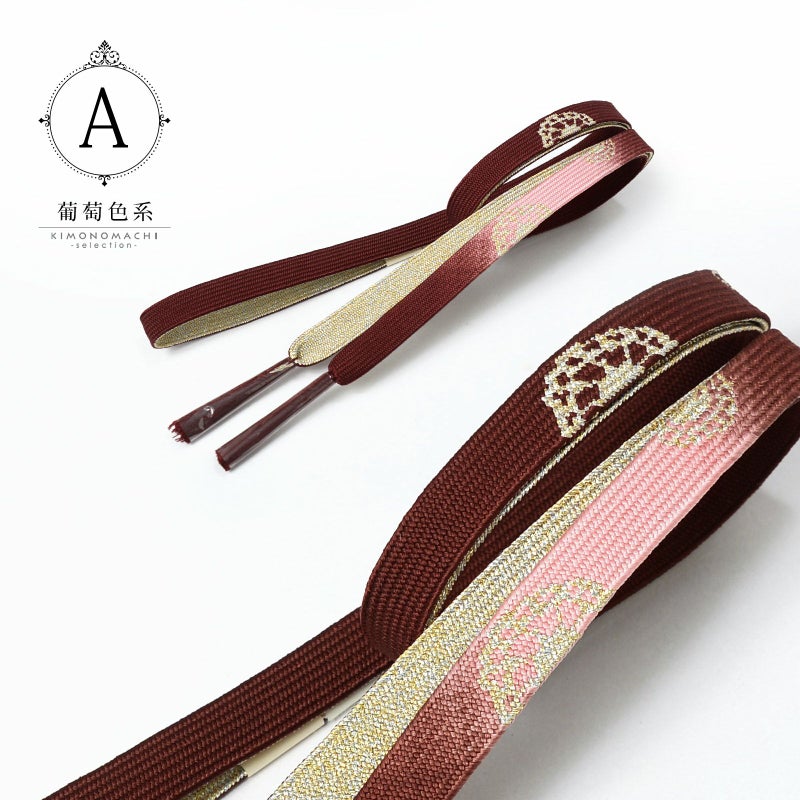 A.葡萄色系:深い赤紫にピンク系のぼかしの地。金銀で車紋がデザインされた帯締めです。裏面は金銀。