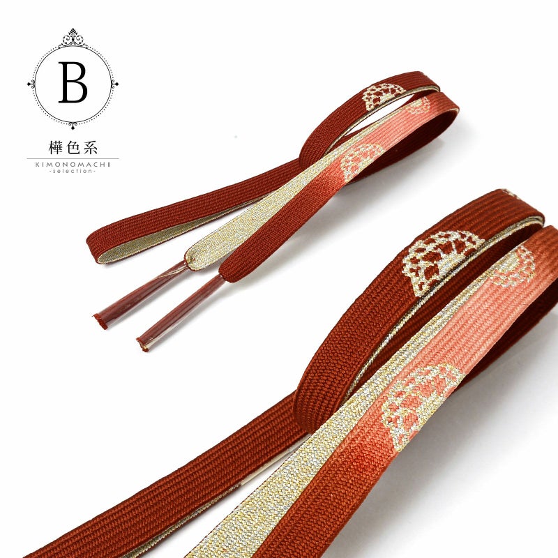 B.樺色系:深い赤茶にピンク系のぼかしの地。金銀で車紋がデザインされた帯締めです。裏面は金銀。