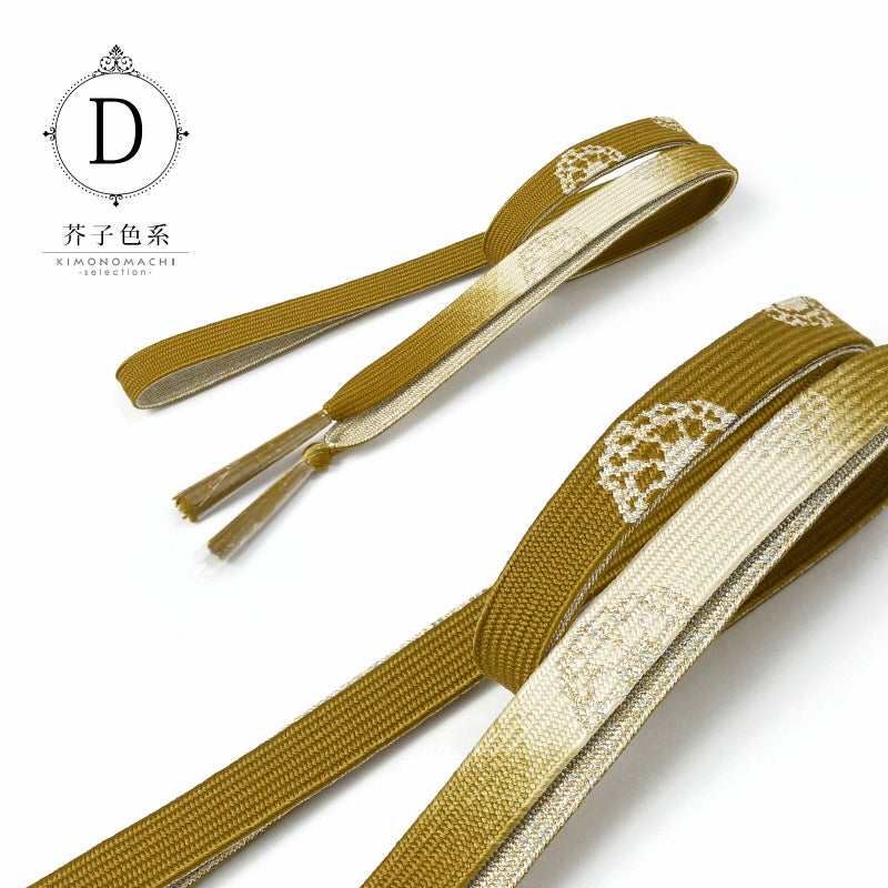 D.芥子色系:黄みの黄土色に生成り色系のぼかしの地。金銀で車紋がデザインされた帯締めです。裏面は金銀。