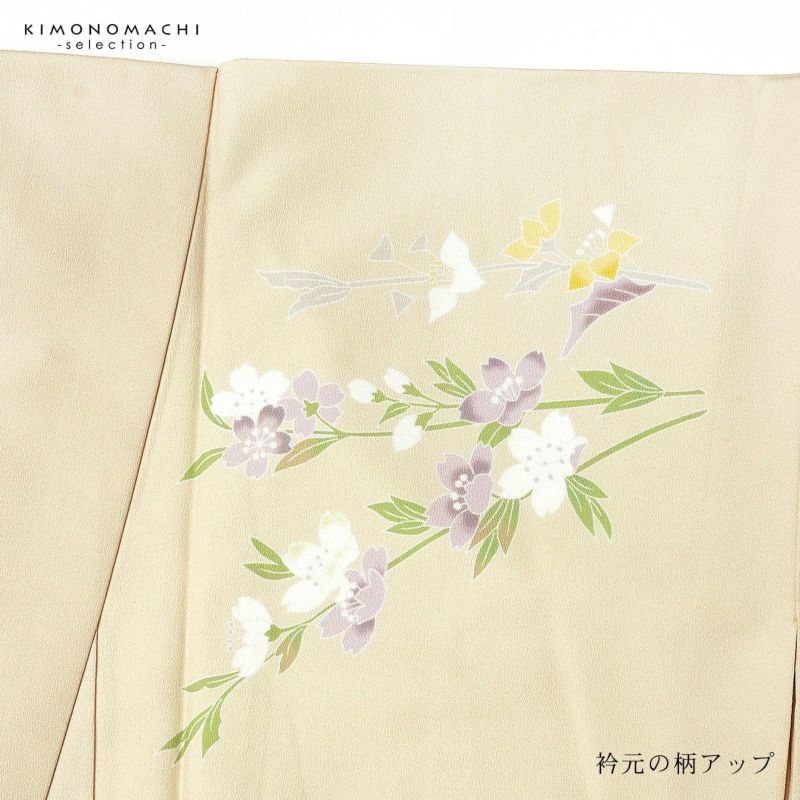 【色柄】グレイッシュな黄みのベージュの地に洗い柿色のぼかし。黄緑、青磁色、白、淡い灰紫に淡い黄色のしだれ桜や牡丹、サーモンオレンジの野菊、灰紫に黄色の露草、グレージュにグリーンの露芝に白の女郎花や尾花が抽象的に表現されています。季節感を限定しない個性と優しい上品さを感じさせる訪問着です。