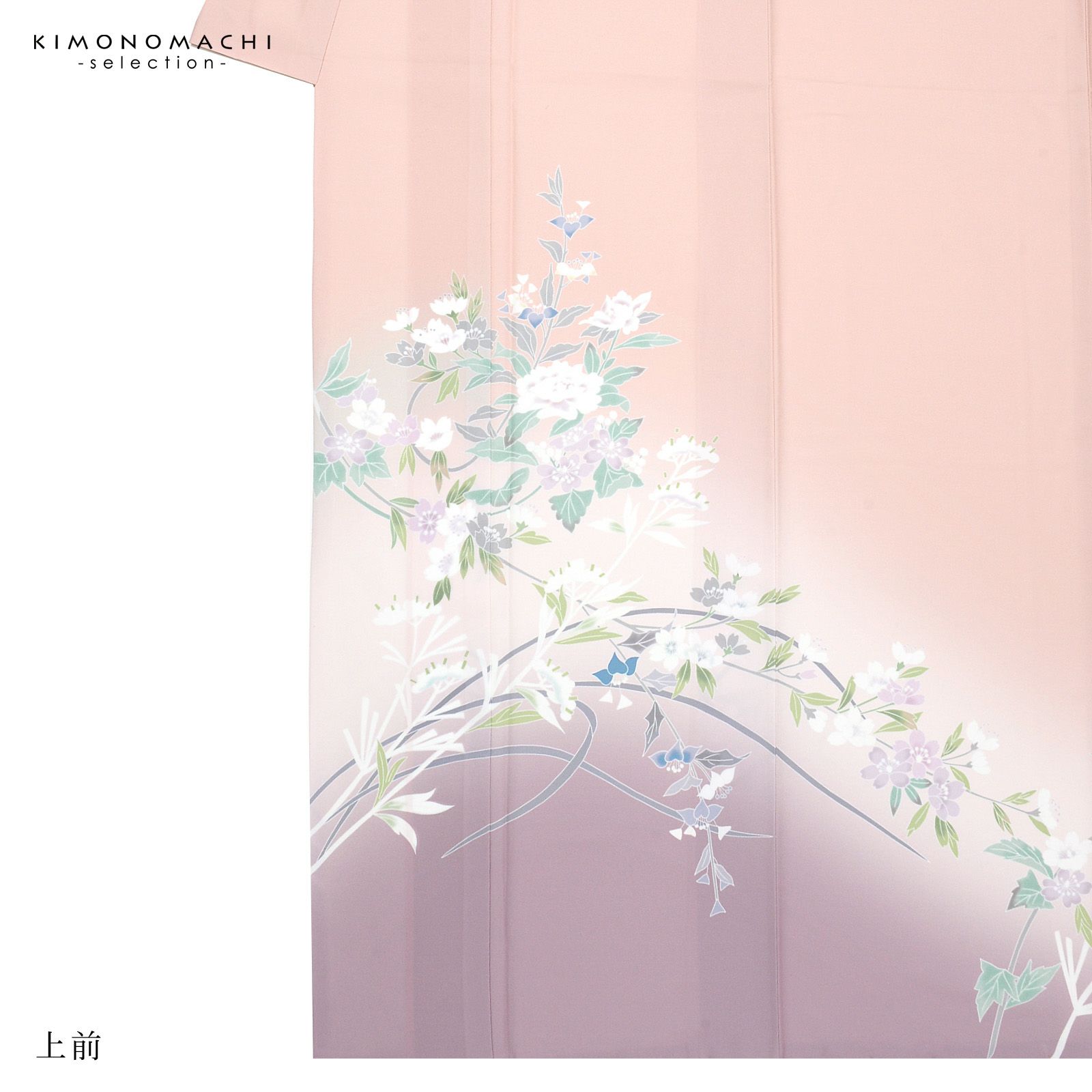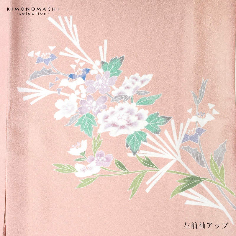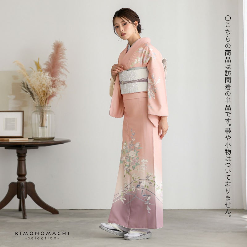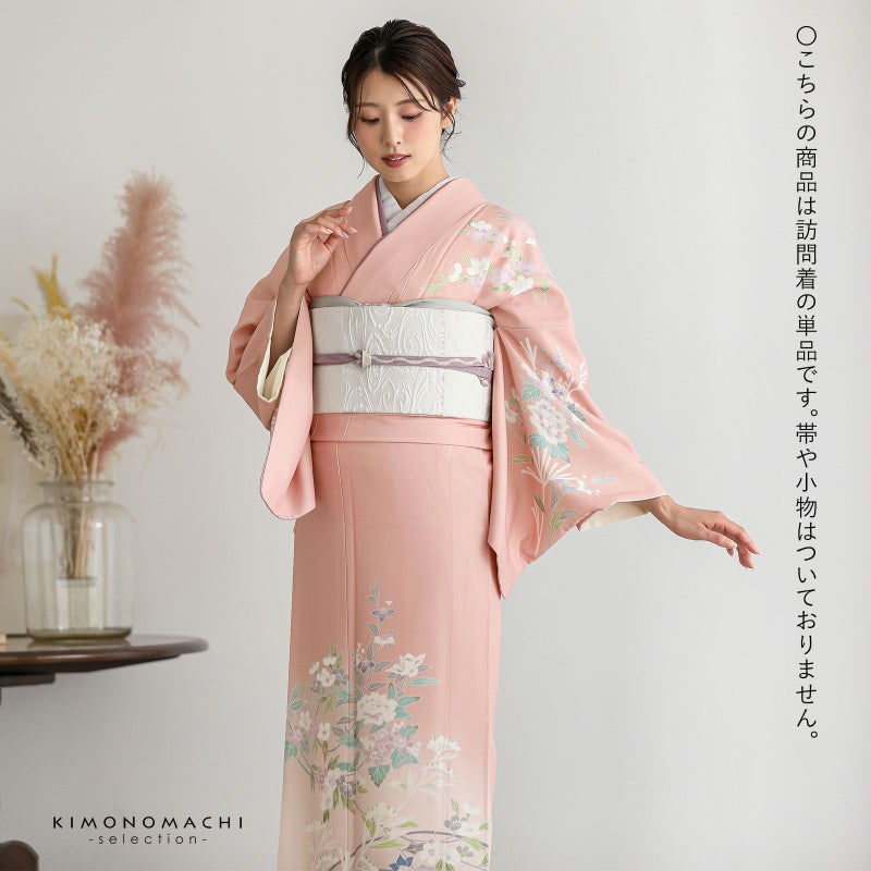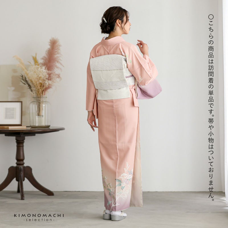 【色柄】グレイッシュな淡い赤みのピンクの地に紅藤色のぼかし。黄緑、青磁色、白、淡い赤紫のしだれ桜や牡丹、野菊、ブルーグレーの露草、グレーの露芝に白の女郎花や尾花が抽象的に表現されています。八掛はオフホワイト。季節感を限定しない個性と華やかさを感じさせる訪問着です。