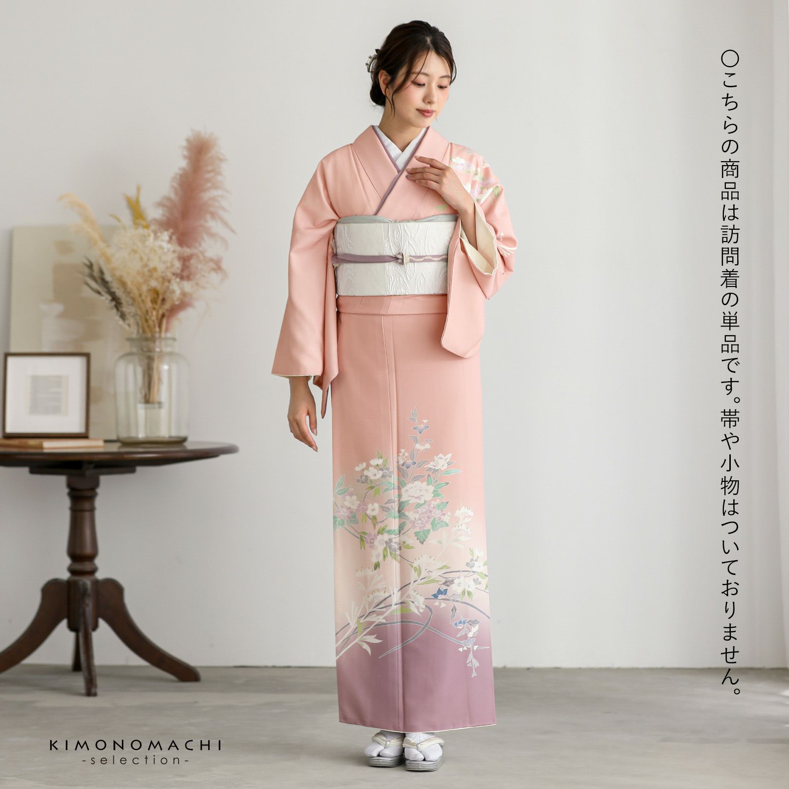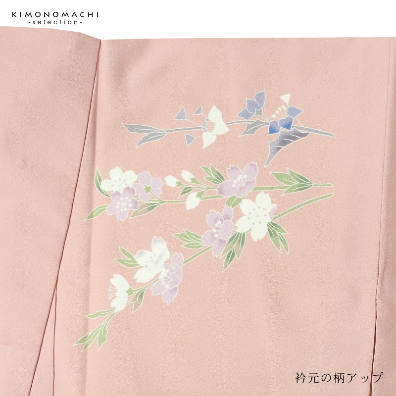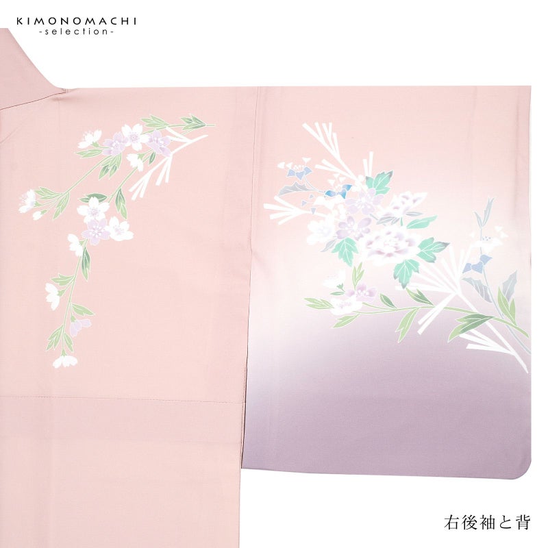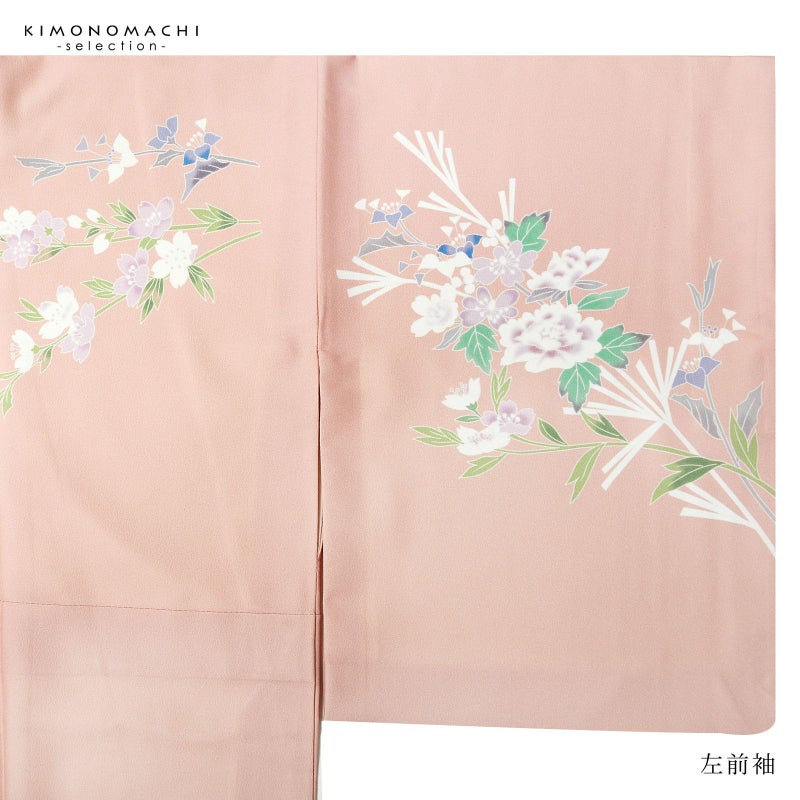 【色柄】グレイッシュな淡い赤みのピンクの地に紅藤色のぼかし。黄緑、青磁色、白、淡い赤紫のしだれ桜や牡丹、野菊、ブルーグレーの露草、グレーの露芝に白の女郎花や尾花が抽象的に表現されています。八掛はオフホワイト。季節感を限定しない個性と華やかさを感じさせる訪問着です。