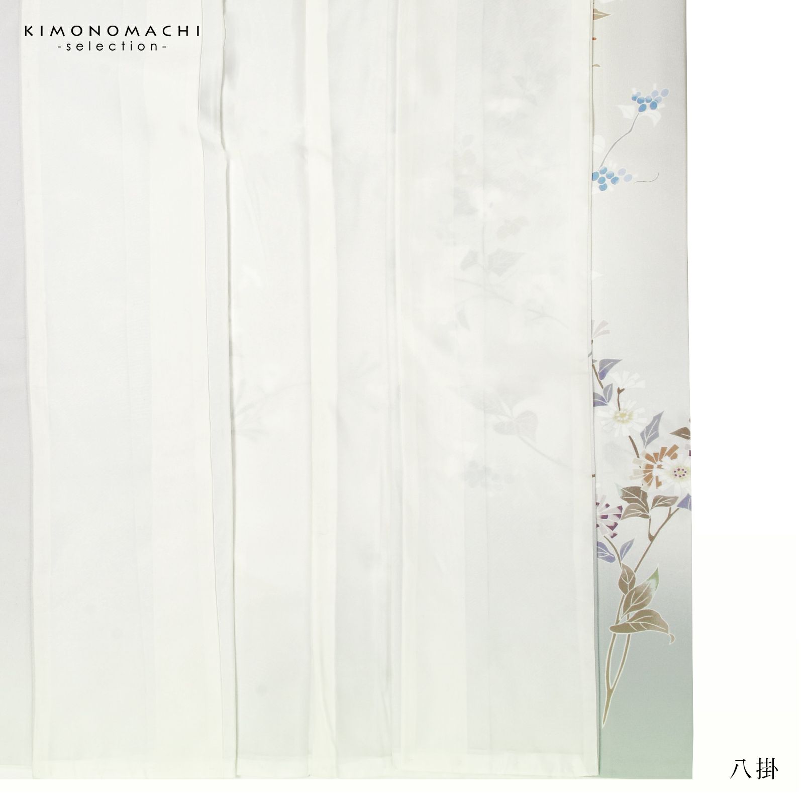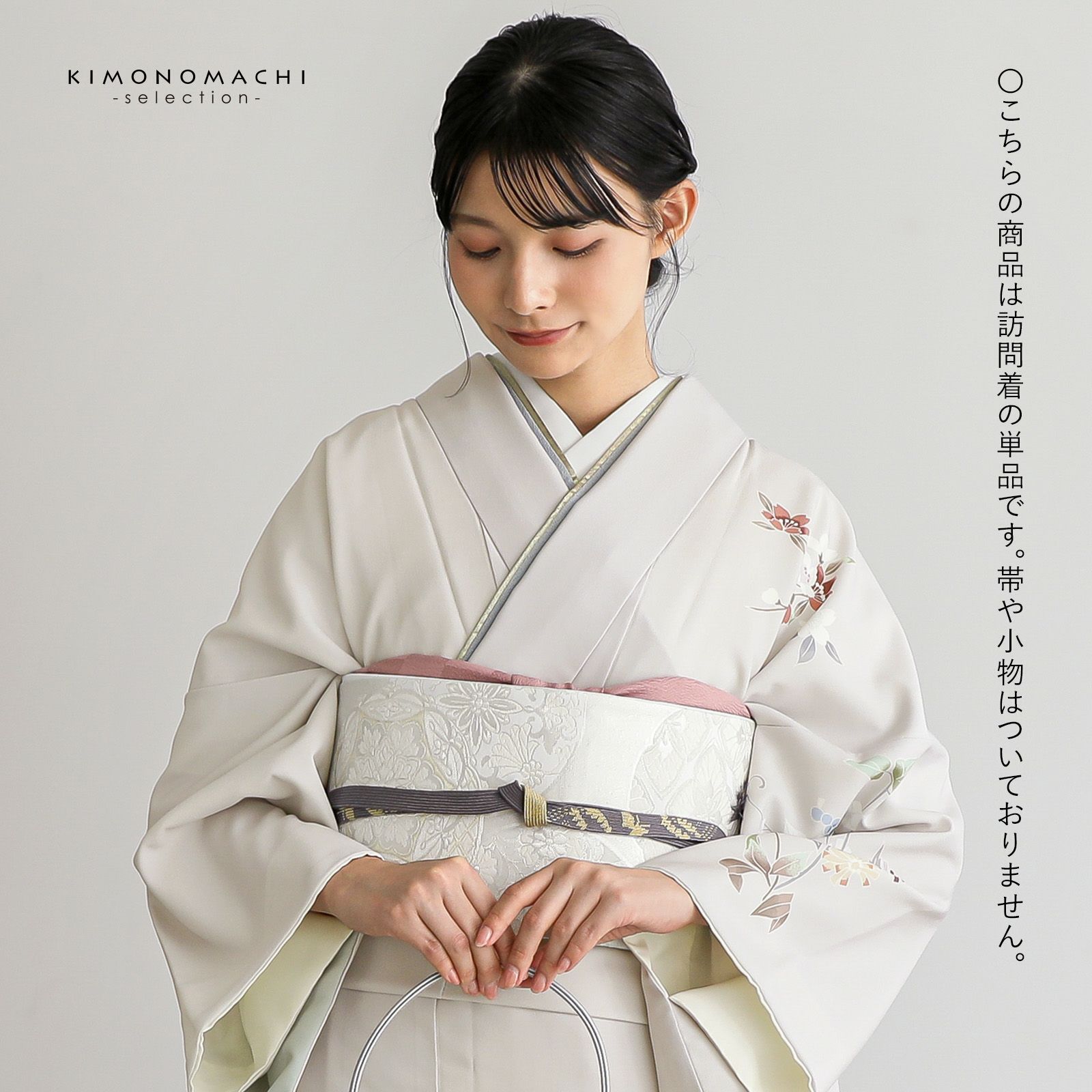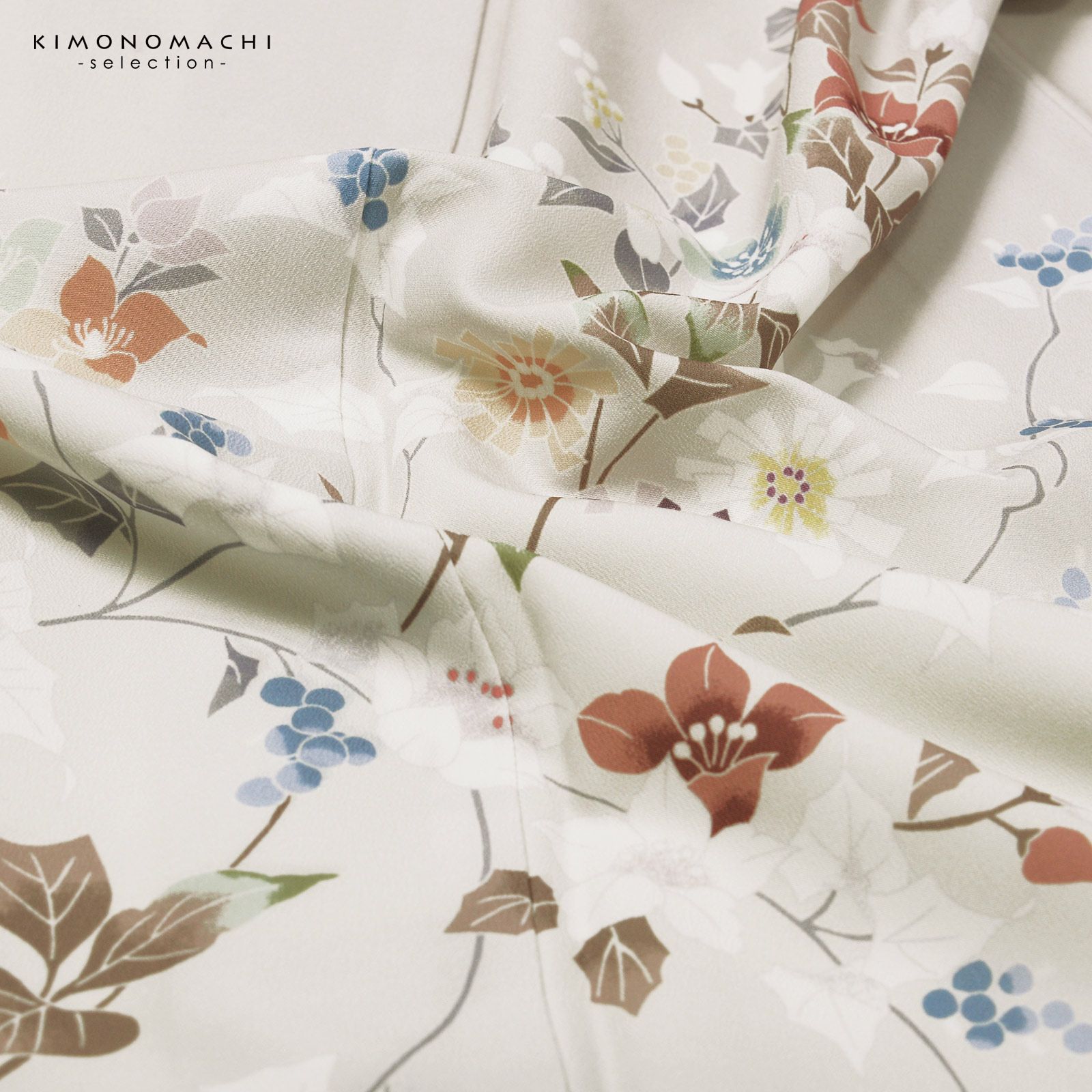 【色柄】やや黄みの淡いグレーの地に蕎麦切色のぼかし。青磁色、淡い青の野葡萄に薄紫、橙色、淡い黄色、白や錆朱の鉄線が抽象的に表現されています。八掛はオフホワイト。季節感を限定せず優しさの中に個性を感じさせる訪問着です。