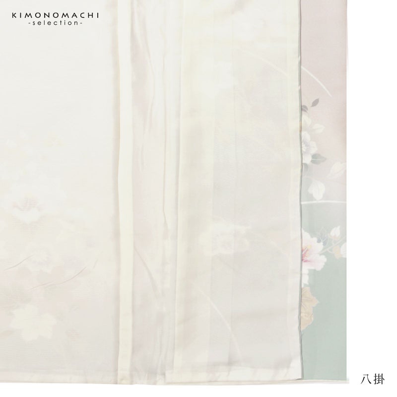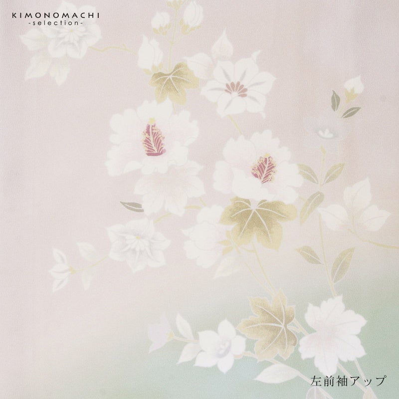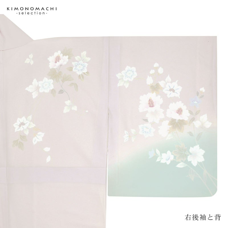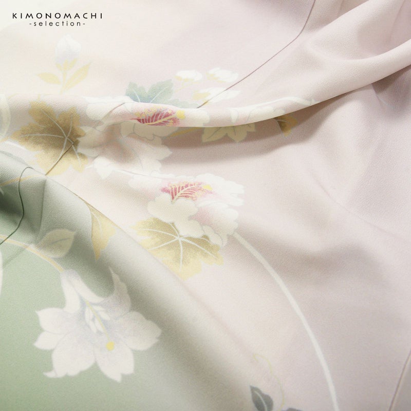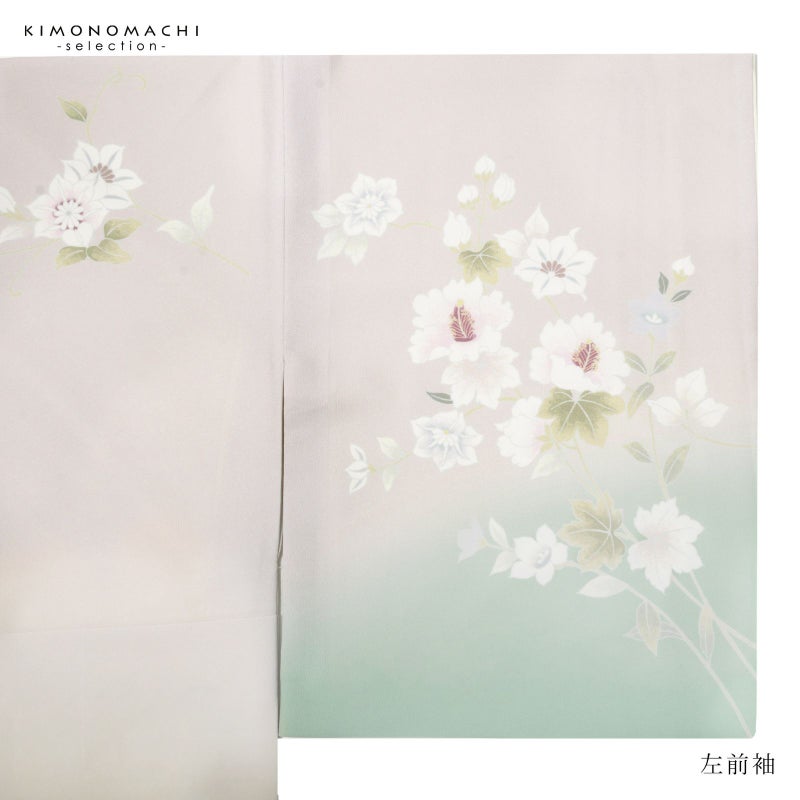 【色柄】わずかにピンクみのある淡いグレーの地に淡い青磁色のぼかし。グレーの糸目に白、淡いピンクに赤紫、薄いブルーグレーに青藤色、浅い抹茶色や黄緑で表現された芙蓉の花、蔦を伸ばす鉄線の花。八掛はオフホワイト。ペールトーンの配色がはんなりと上品な雰囲気の訪問着です。