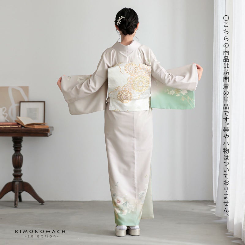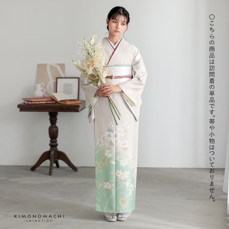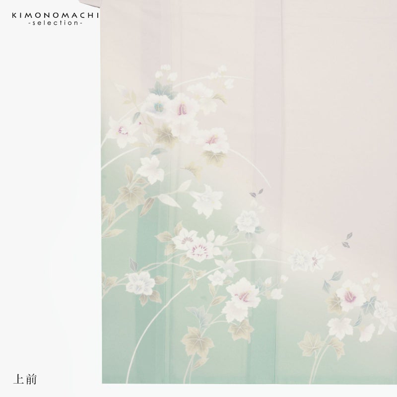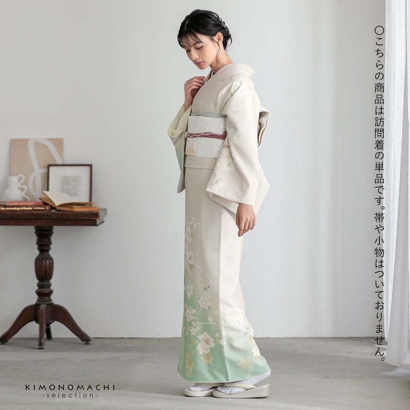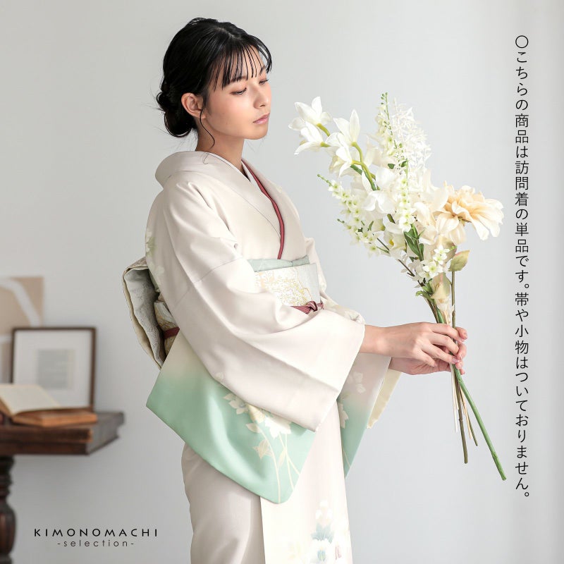 【色柄】わずかにピンクみのある淡いグレーの地に淡い青磁色のぼかし。グレーの糸目に白、淡いピンクに赤紫、薄いブルーグレーに青藤色、浅い抹茶色や黄緑で表現された芙蓉の花、蔦を伸ばす鉄線の花。八掛はオフホワイト。ペールトーンの配色がはんなりと上品な雰囲気の訪問着です。