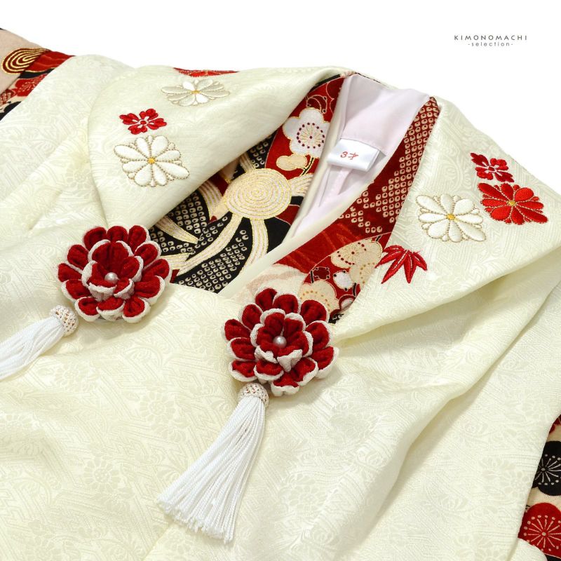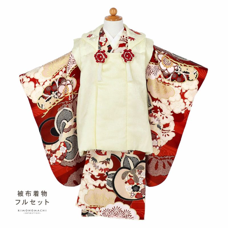 【色柄】被布コートは地模様のあるクリーム色。衿にアイボリーと赤の花菱の刺繍。紅白のつまみのお花の被布飾り。着物は深い赤の地に赤の流水。黒、臙脂、ベージュで大きなねじ花に橘、松竹梅が全体に表現されています。大きな花や橘の中に梅、菊などの花紋。ポイントに金彩。重ね衿はアイボリー。薄ピンクの長襦袢。草履は白の台に赤の鹿の子の鼻緒。巾着は被布コートと共布。紅白の二重丸つまみのお花にアイボリーのつまみの房の髪飾り。