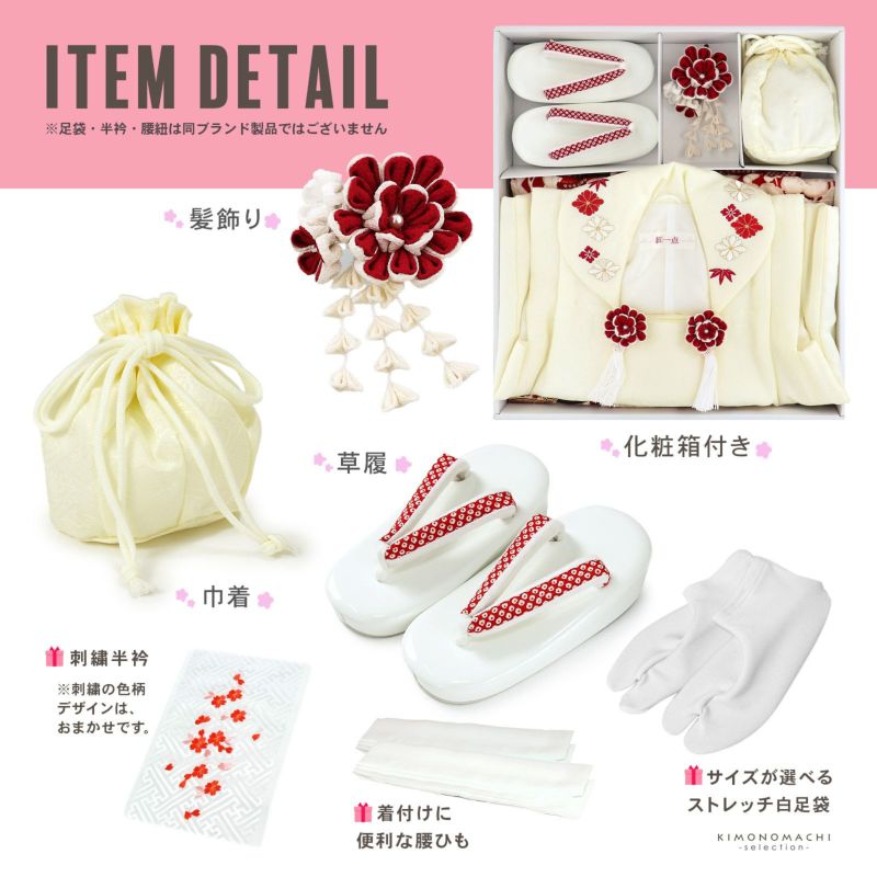 【商品内容】着物・長襦袢・重ね衿(縫い付け済)・被布コート・巾着・髪飾り・草履・刺繍半襟(プレゼント)・足袋(プレゼント)・腰ひも2本(プレゼント)の計10点