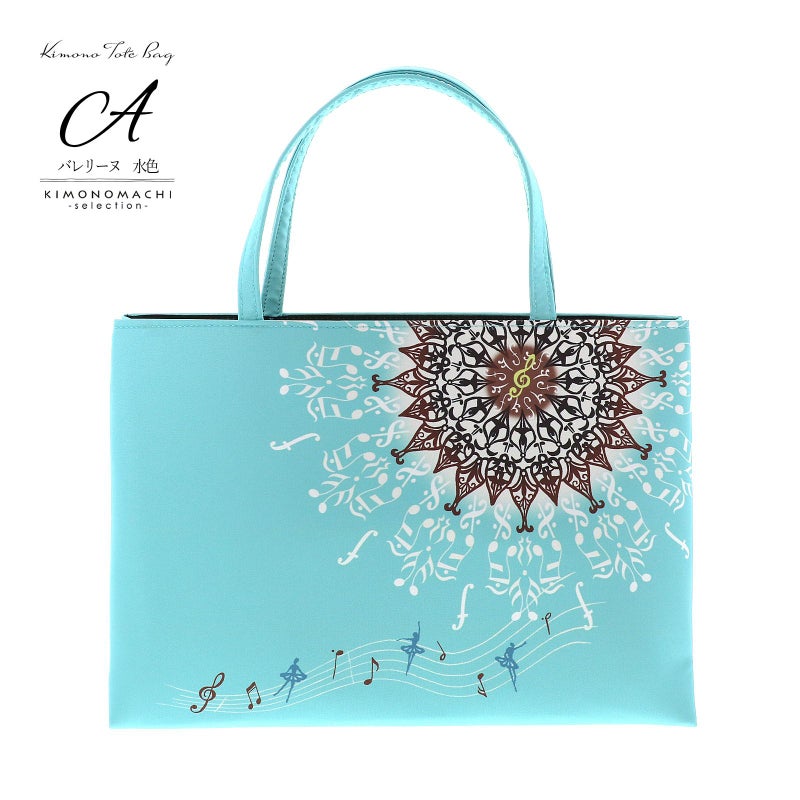 A.バレリーヌ 水色:ややグレイッシュな明るい水色の地。白の五線譜にこげ茶の音符に合わせ、薄青のバレリーナたちが踊るデザイン。黒、茶、白の大きな唐花は、よく見ると音楽記号とバレエダンサーを組み合わせた構成となっています。
