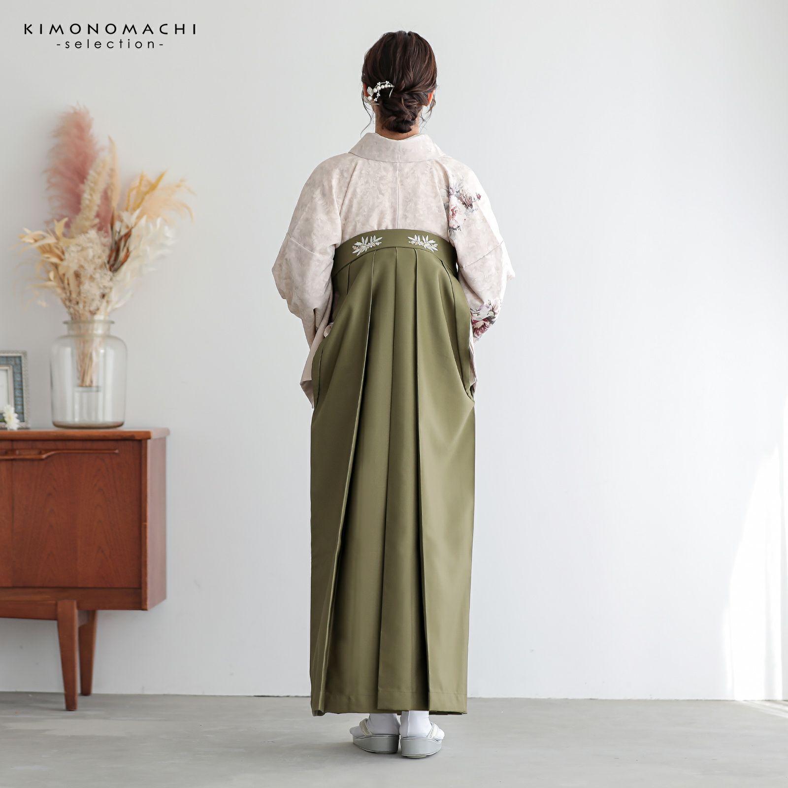 袴:灰みの黄緑色系のオリーブ色の地、腰の後ろ部分にシルバーグレーやグレージュ、ポイントに金糸の入った南天の刺繍。