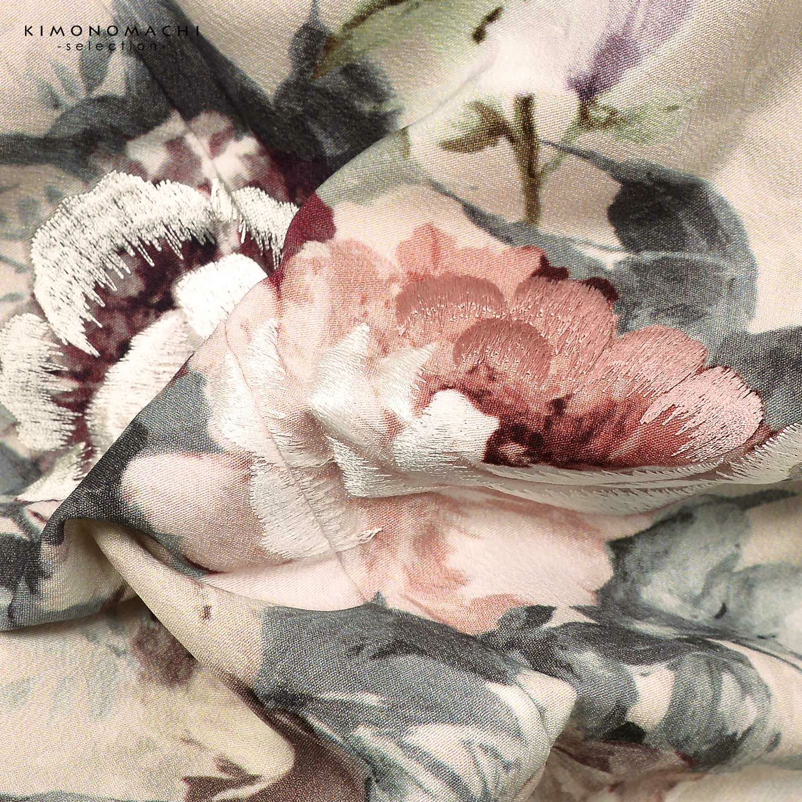 訪問着:ややグレイッシュな淡い藤色に濃淡のある葉の文様が全体に表現されています。クリーム色、浅いくすんだ赤紫、チャコールグレーの洋花のブーケ。上前のポイントに刺繍が施され、華やかさを添えます。モダンな洒落感のある訪問着です。