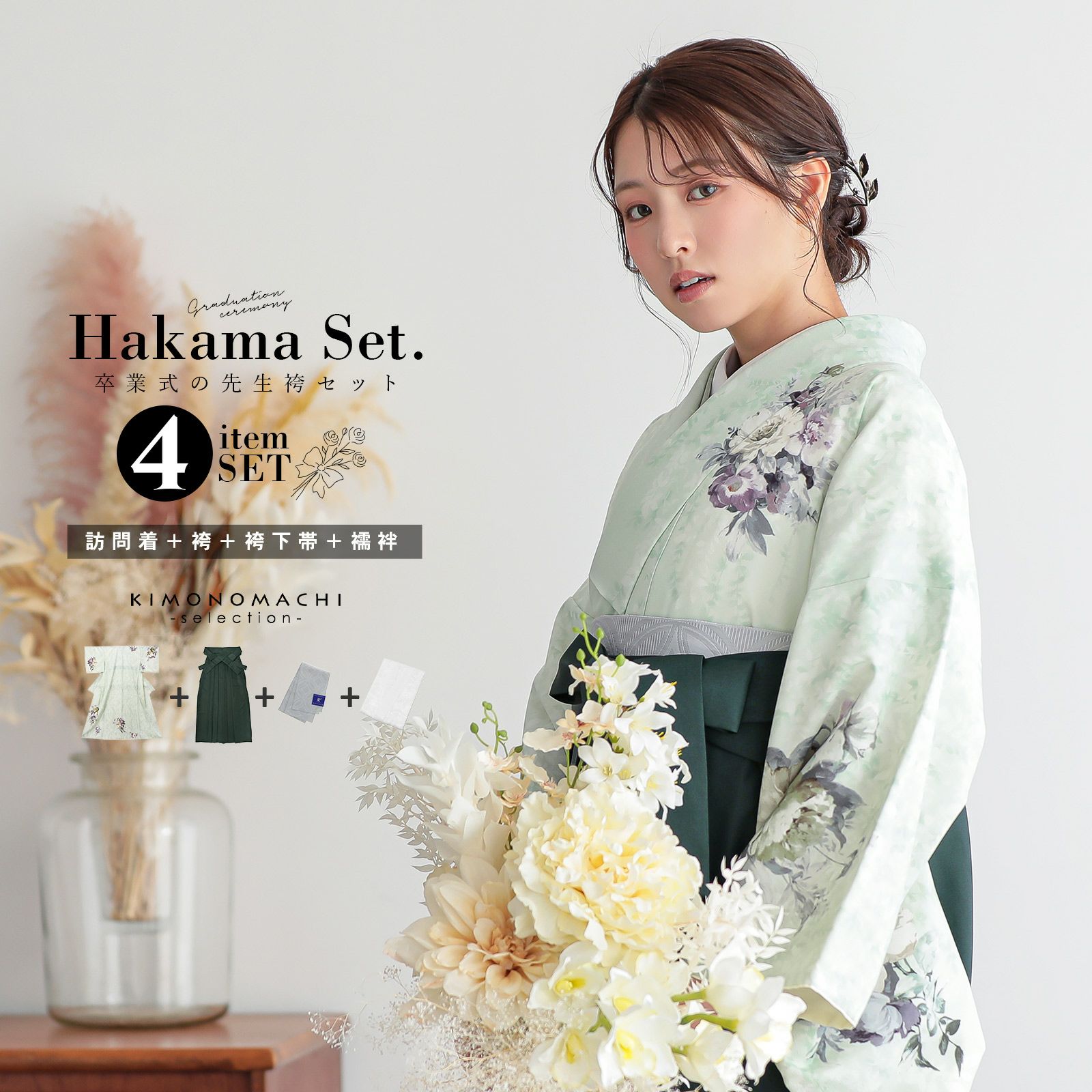 訪問着と袴に、帯と襦袢がついた4点セットです。