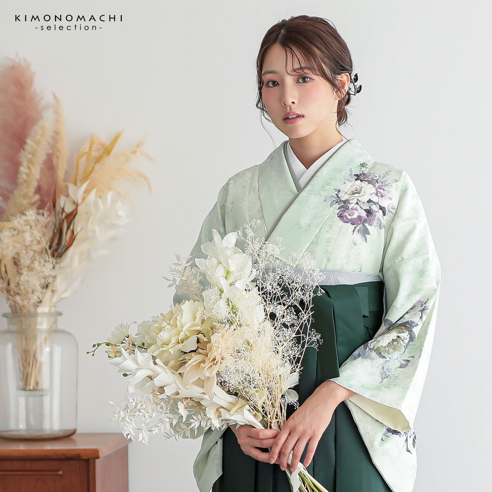 袴:灰みの黄緑色系のオリーブ色の地、腰の後ろ部分にシルバーグレーやグレージュ、ポイントに金糸の入った南天の刺繍。