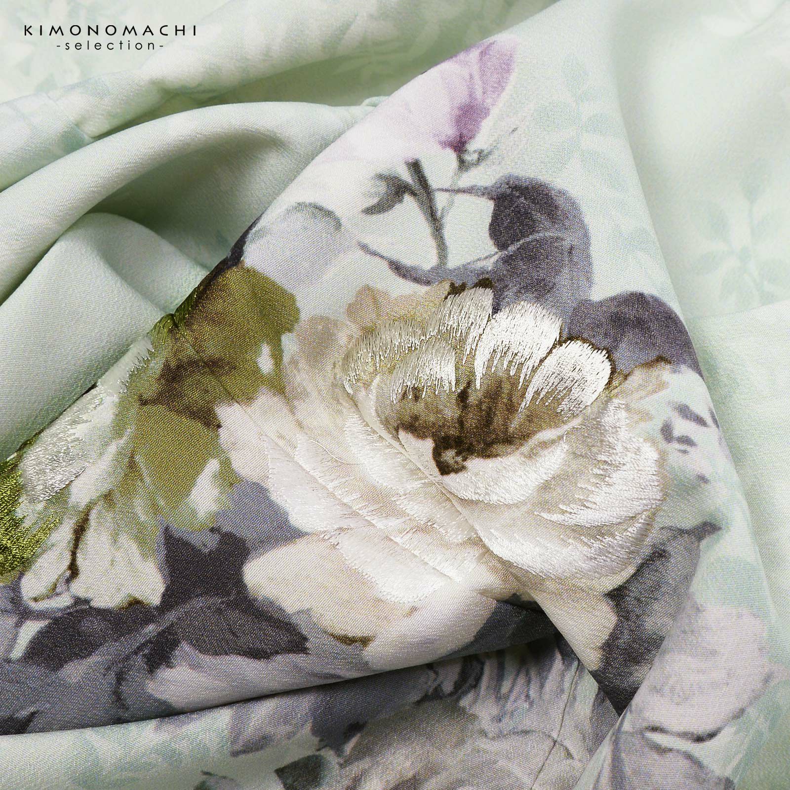 訪問着:ややグレイッシュな淡い藤色に濃淡のある葉の文様が全体に表現されています。クリーム色、浅いくすんだ赤紫、チャコールグレーの洋花のブーケ。上前のポイントに刺繍が施され、華やかさを添えます。モダンな洒落感のある訪問着です。